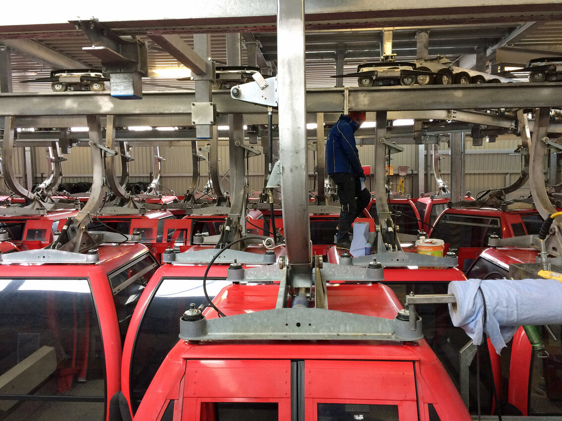 Nachdem die Streckenrevision abgeschlossen ist, werden die Personenkabinen auf Vordermann gebracht. Auch hier ist der gleiche Trupp zuständig. Die Gondeln bekommen außen und auch innen ein Facelifting. Ein "Rundum-Wohlfühlprogramm“ sozusagen.