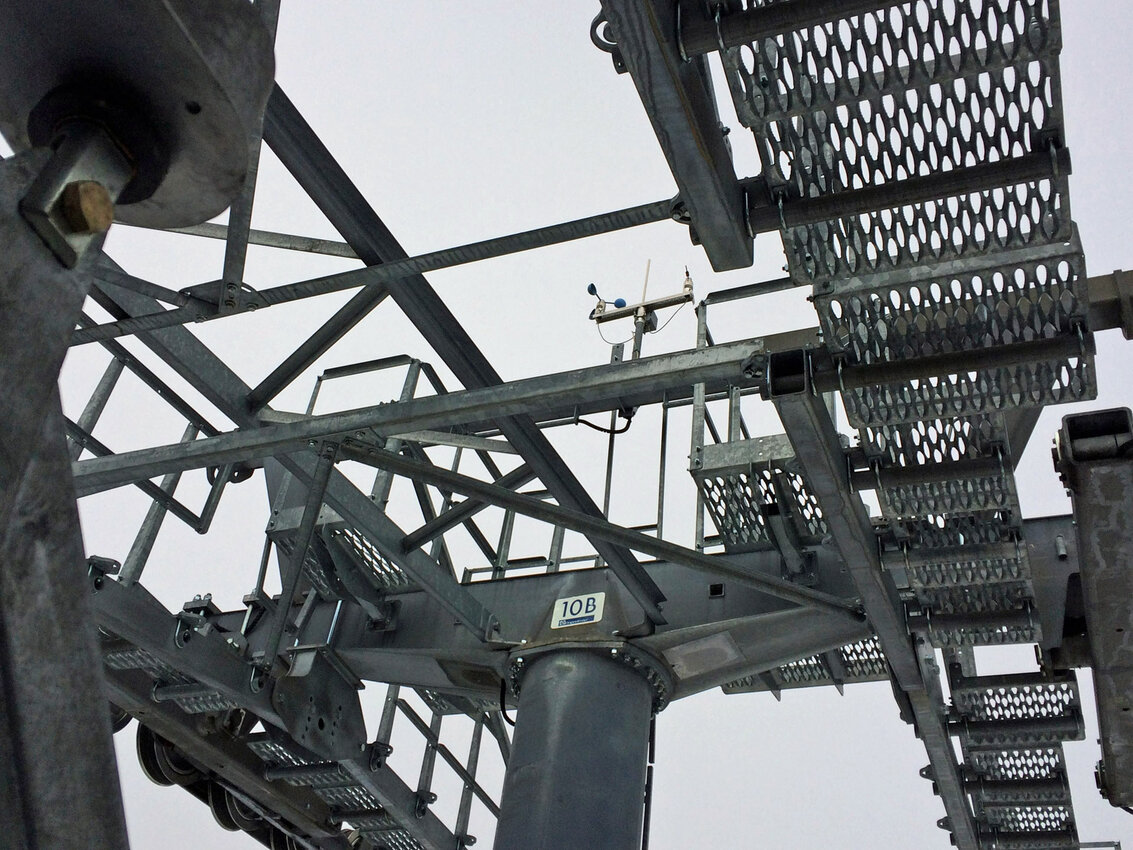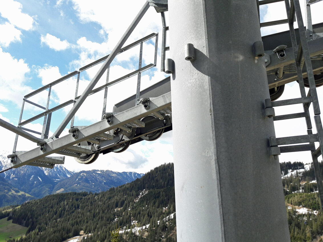 Weitere wichtige Elemente sind natürlich auch die Stützen. Martin erklärt mir, was eine Wechsellaststütze ist: „Hierbei handelt es sich um eine Stütze, bei der das Seil ober- und unterhalb durch Seilrollen geführt wird. Diese Stützen sind sehr zeitaufwendig, da sie sehr viele Rollen besitzen.“ Beim Nachzählen komme ich auf 16 Rollen pro Richtung. Es gilt dabei: Je mehr Rollen, desto größer ist die Last, die die Stütze tragen muss. Die Höhe der Stützen ist immer an das Gelände angepasst und variiert zwischen 8 und 40 Metern. Die höchste Stütze befindet sich bei der Möseralmbahn.