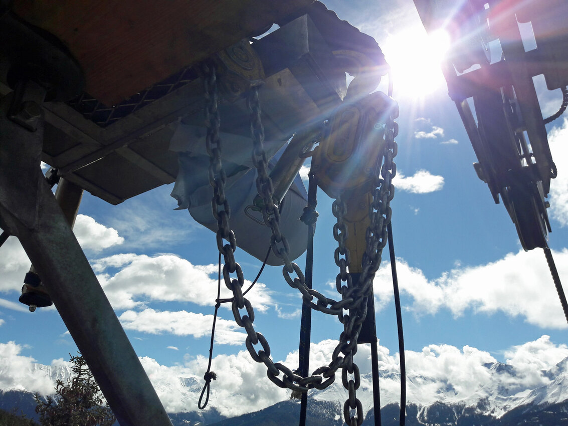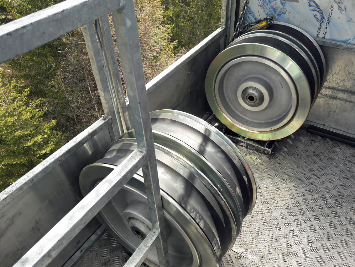 Bei einem stattlichen Gewicht von 50 kg pro Rolle, benötigen die Mitarbeiter mit Sicherheit keine Hanteln mehr. Martin erzählte mir, dass der Gummibelag einer Rolle sich je nach Betriebsstunden, Witterung und Last unterschiedlich abnutzt. Interessanterweise nutzt sich eine Rolle im Sommer stärker ab als im Winter, obwohl die Last geringer ausfällt. Die höheren Temperaturen gehen dem Material an den Leib. Zweimal pro Jahr werden alle Rollen kontrolliert. Ist eine Rolle abgenutzt (vergleichbar mit einem Autoreifen), kann sie direkt vor Ort getauscht werden. Im Revisionskorb führte „mein“ Revisionstrupp einige neue Rollen mit. Mit einer hydraulischen Handpumpe, einem Handkran und einer Seilwinde (Seil eines demontierten Schleppbügels) wurden an der Stütze Nr. 4 die Rollen getauscht.