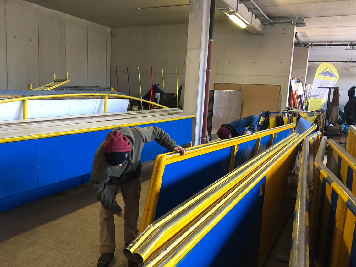Zu den zahlreichen Aufgaben, die erledigt werden müssen, gehören auch die Vorbereitungen der Fun Areas. Die zahlreichen Rails, Boxen und Walls werden natürlich gleich nach der Wintersaison in die Halle gebracht, um in der hauseigenen Schlosserei wieder auf Vordermann geschweißt und gestrichen zu werden. Somit können wir im nächsten Winter wieder genüsslich über blau-gelbes Metall shredden.