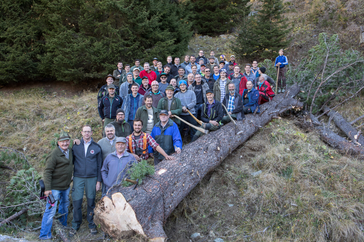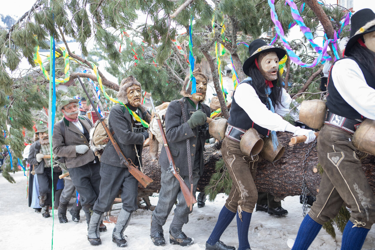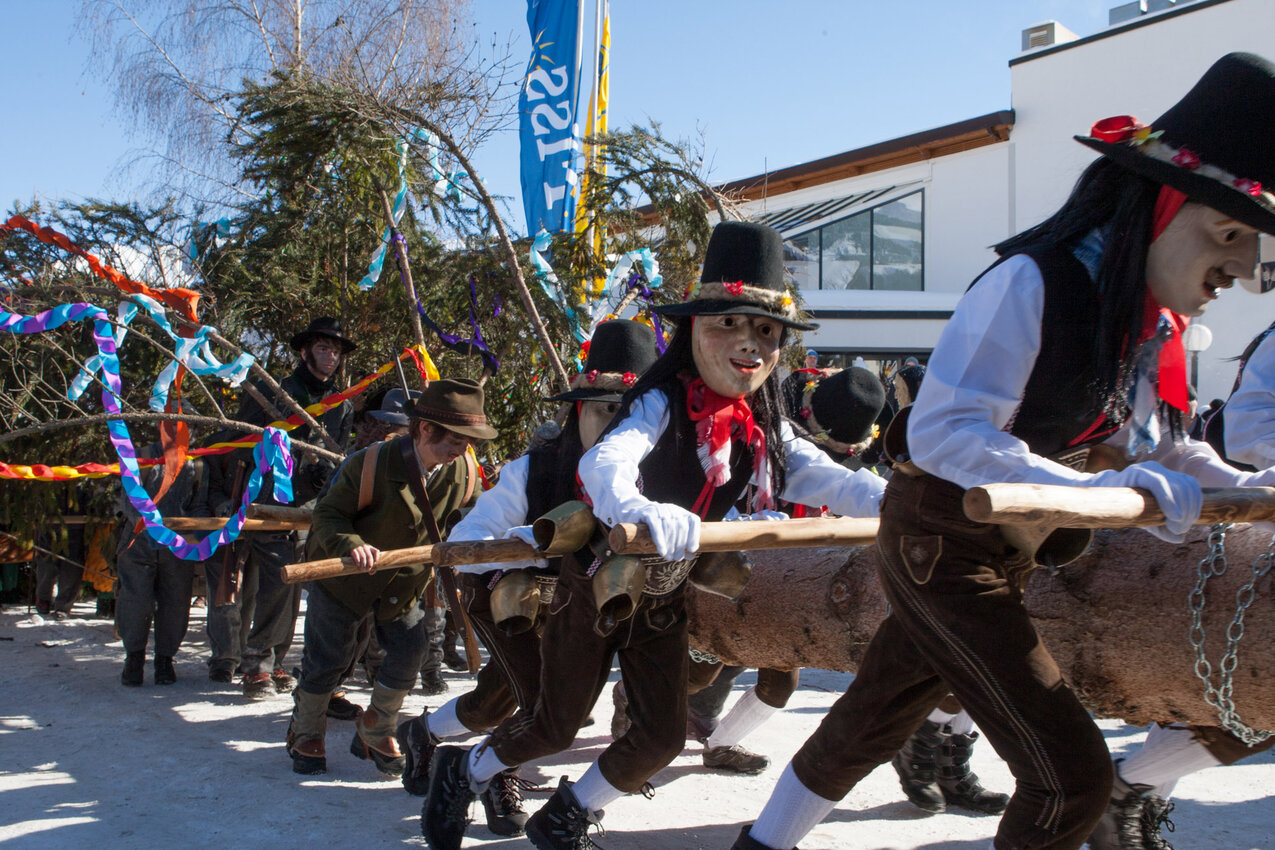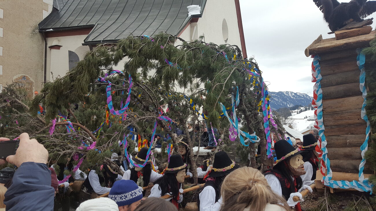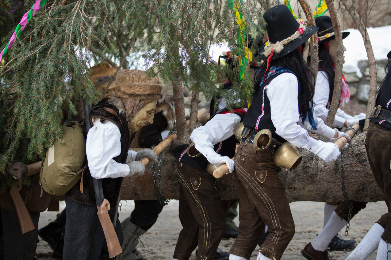 Markus: Rund 40 Fisser Männer gehen an einem Tag im Oktober in den Wald um den Blochbaum, einen mächtigen Zirbenstamm, zu holen. Dieser wird vom Waldaufseher ausgesucht und spendiert. Ein Mitarbeiter der Agrargemeinschaft schneidet den Baum schlussendlich um. Dann wird er in zwei Teile zerlegt und ins Dorf transportiert. Der erste Teil auf einem LKW und der zweite Teil des Baumes wird mit einem Traktor ins Dorf gezogen. Gelenkt wird der Stamm von Hand. Dafür braucht es immer mindestens vier Männer.