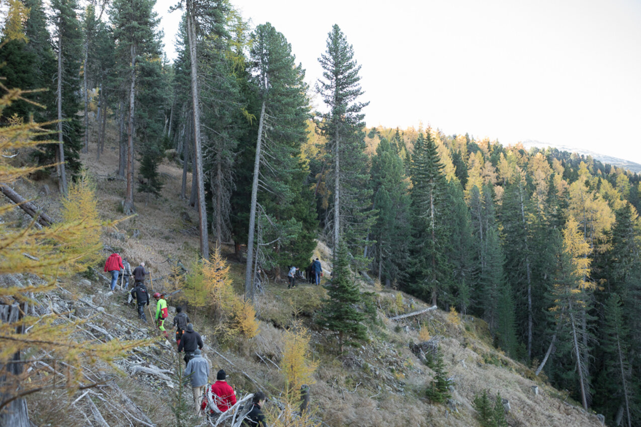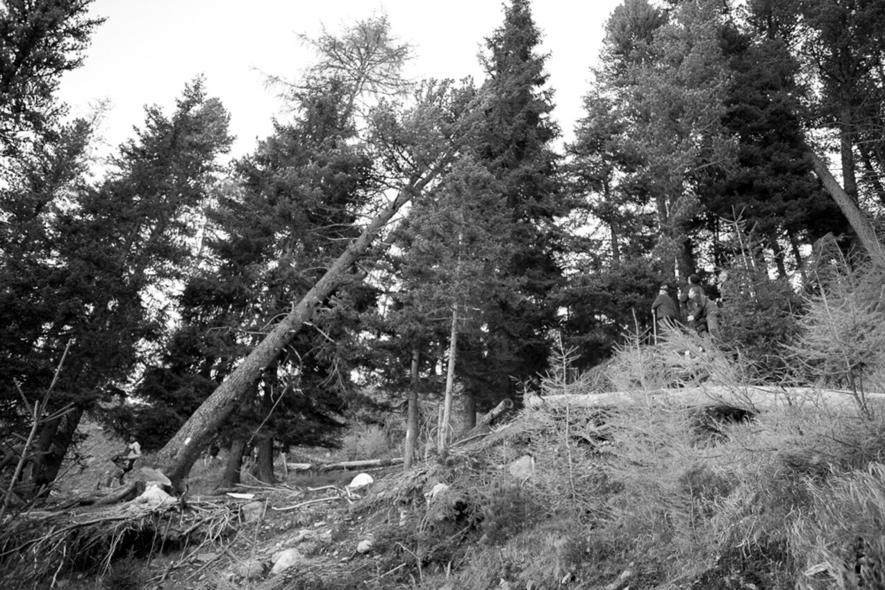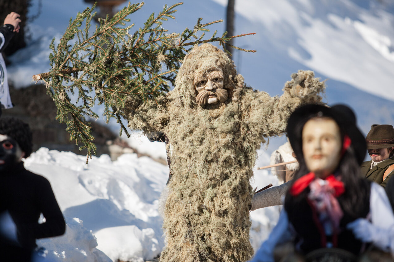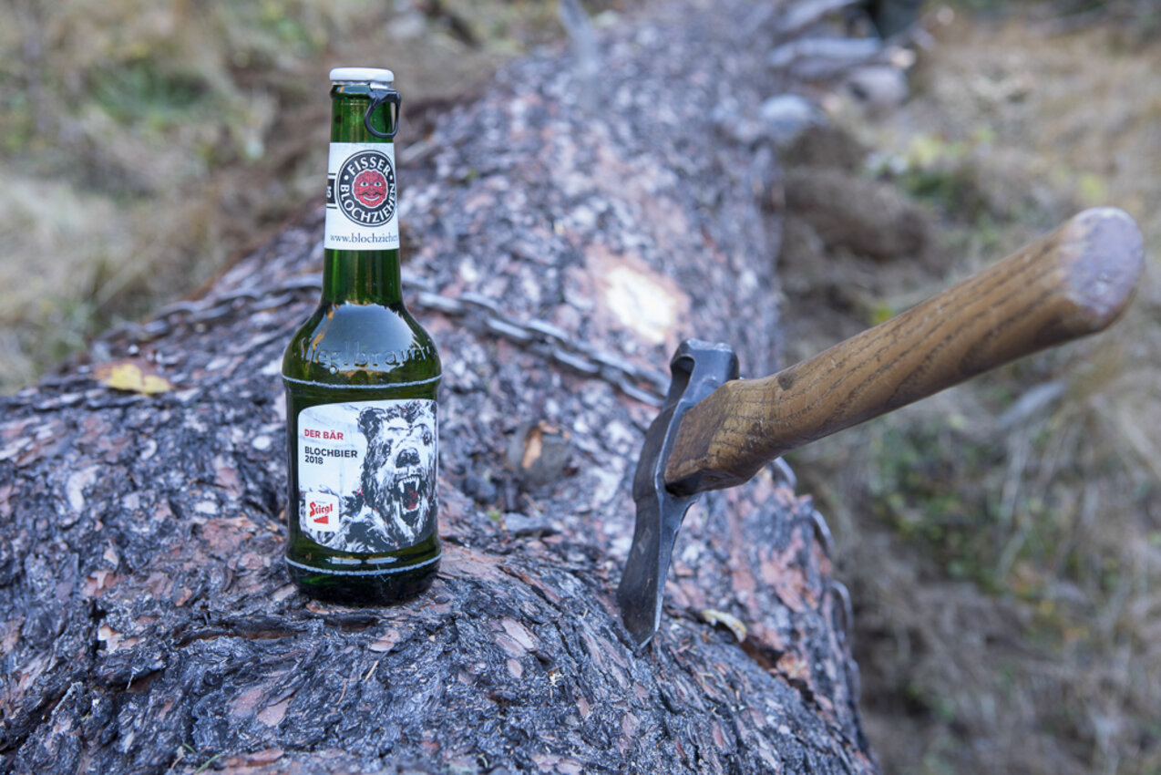 Markus: Rund 40 Fisser Männer gehen an einem Tag im Oktober in den Wald um den Blochbaum, einen mächtigen Zirbenstamm, zu holen. Dieser wird vom Waldaufseher ausgesucht und spendiert. Ein Mitarbeiter der Agrargemeinschaft schneidet den Baum schlussendlich um. Dann wird er in zwei Teile zerlegt und ins Dorf transportiert. Der erste Teil auf einem LKW und der zweite Teil des Baumes wird mit einem Traktor ins Dorf gezogen. Gelenkt wird der Stamm von Hand. Dafür braucht es immer mindestens vier Männer.