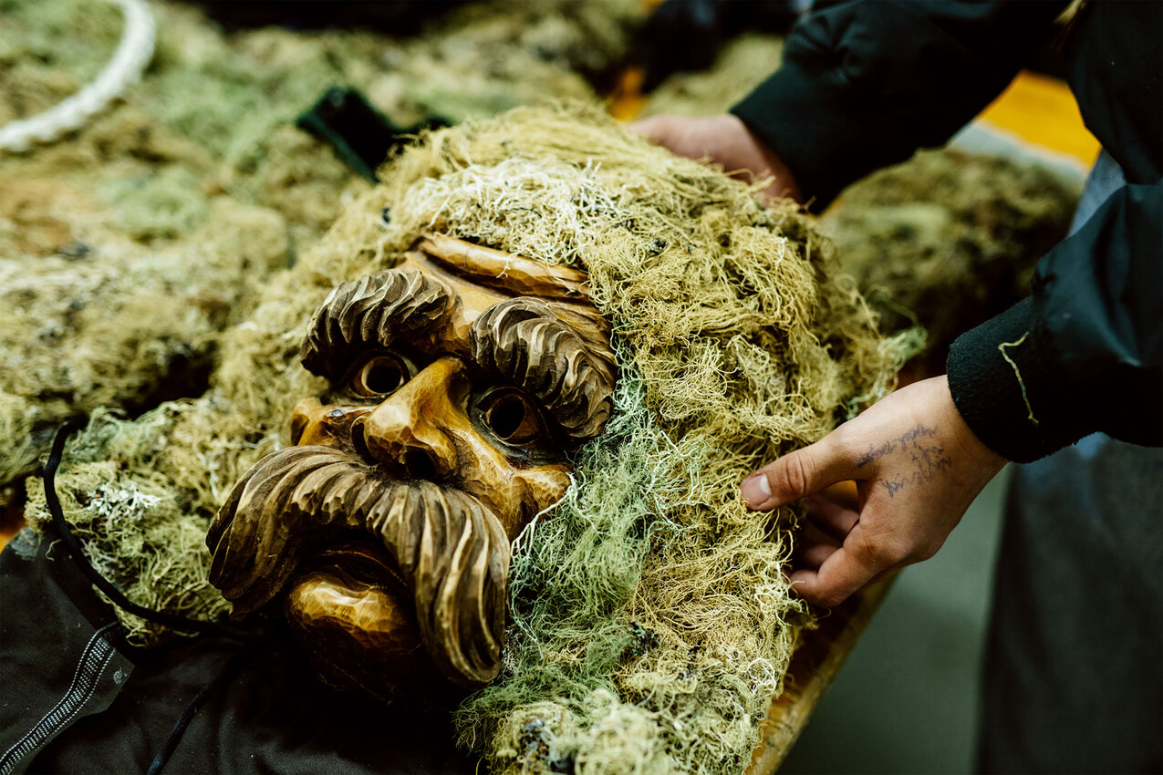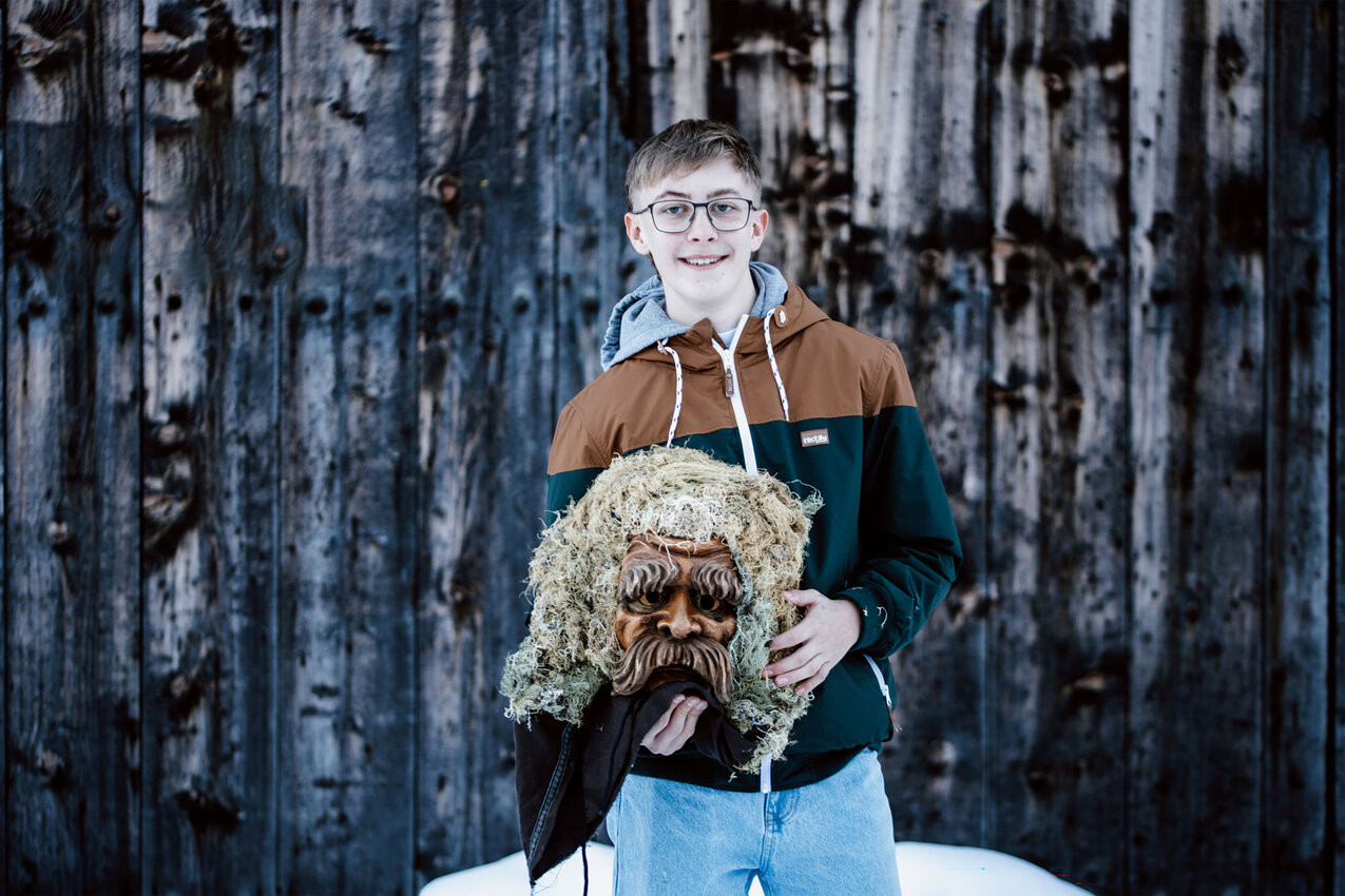 Das Kostüm des „Miasmann“, des Moosmannes, liegt ausgebreitet auf einem großen Tisch: Über und über in liebevoller Handarbeit mit Moos und Flechten beklebt, wartet es geduldig auf seinen Einsatz. „Da braucht man auf jeden Fall Hilfe beim Anziehen. Alleine schafft man das nicht“, sagt Jakob Rietzler. Der junge Fisser gehört als Schüler der Abschlussklasse (4. Klasse) der Mittelschule Serfaus-Fiss-Ladis zum Ausschuss des Kinderblochziehens und ist stellvertretender Obmann. Bei der Fasnacht am 28.1.2024 wird er eine der Hauptrollen, den wilden Miasmann, verkörpern. „Ich komme beim zweiten Stopp aus dem Wald. Dann habe ich einen Baum dabei und verkörpere den Wald, das Wilde, die Natur. Und ich verstehe mich am Anfang gar nicht mit dem Bär, aber dann vereinen wir uns doch, damit der Bloch zum Ziel gelangen kann.“