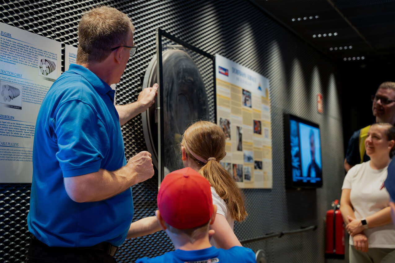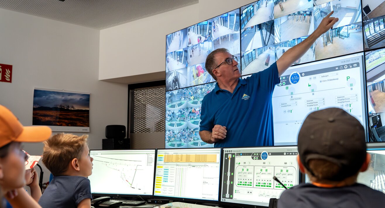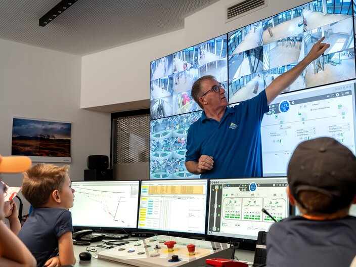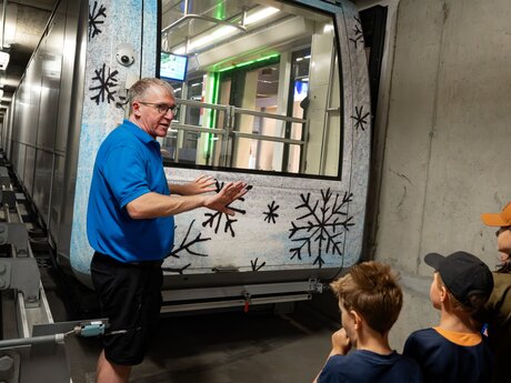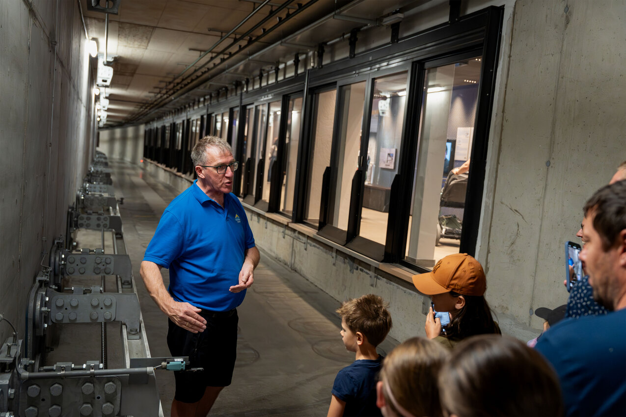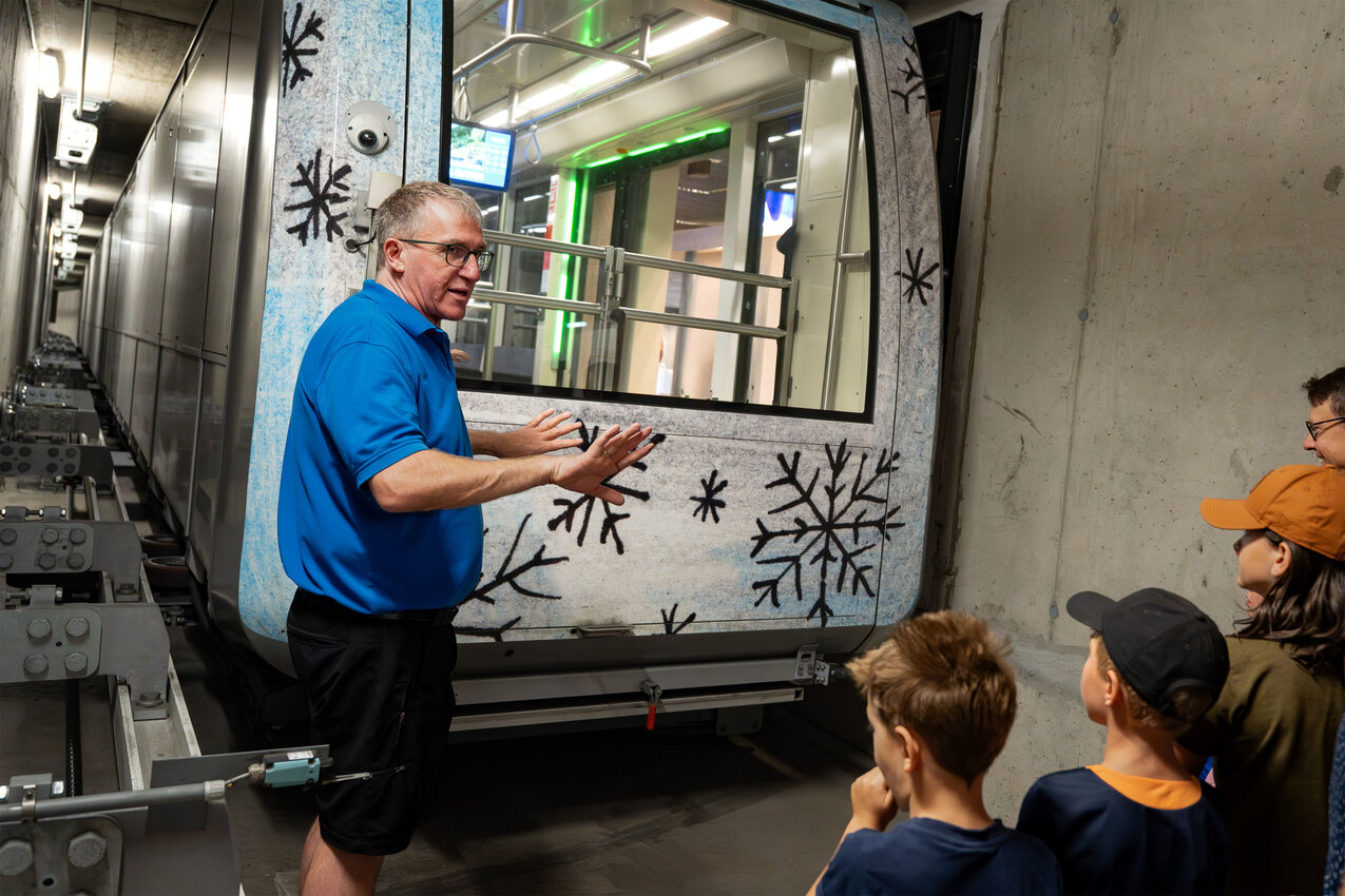 Los geht die Führung dann bei der U-Bahn-Station Seilbahn gleich nebenan: Hier bringt die U-Bahn im ca. 10-Minuten-Takt Gäste, die Richtung Berg gondeln wollen. „Diese U-Bahn hier ist schon die zweite Generation“, erklärt Wolfi. Die erste wurde im Jahr 1985 gebaut und lief bis 2019; viele der Teilnehmer erinnern sich auch noch an die alten Waggons. „Wisst ihr, was der große Vorteil der neuen U-Bahn ist?“, will Wolfi wissen. „Die barrierefreie Erreichbarkeit – das ist uns als Familiendestination besonders wichtig – und außerdem die erhöhte Förderkapazität: Bis zu 3.000 Personen pro Stunde können mit der neuen U-Bahn fahren! Damit kann es uns nicht mehr passieren, dass jemand nicht einsteigen darf.“