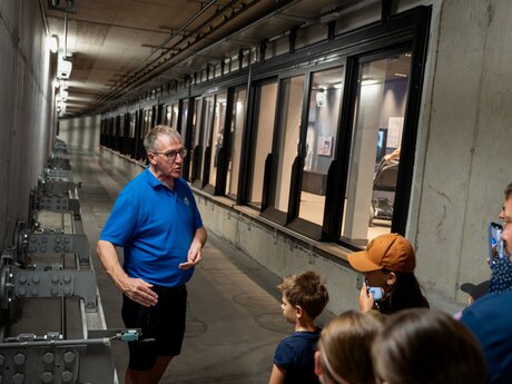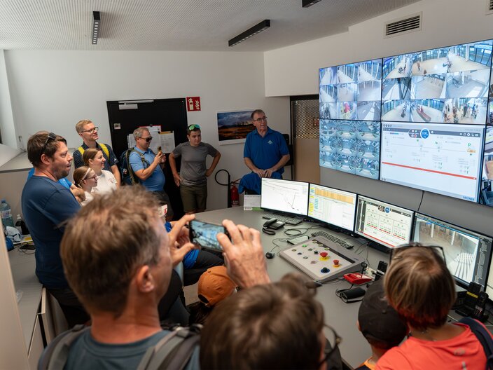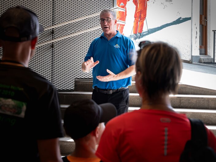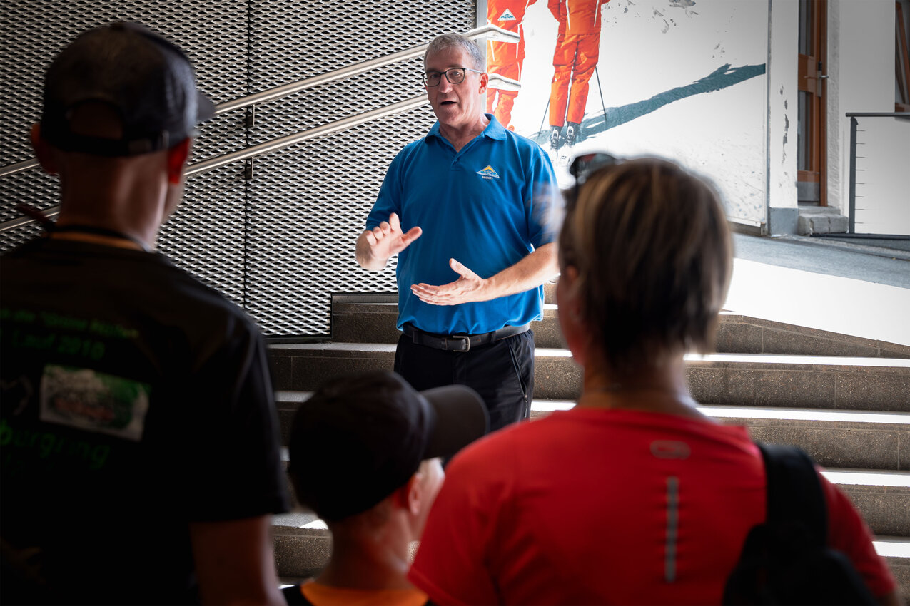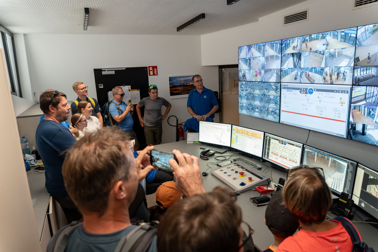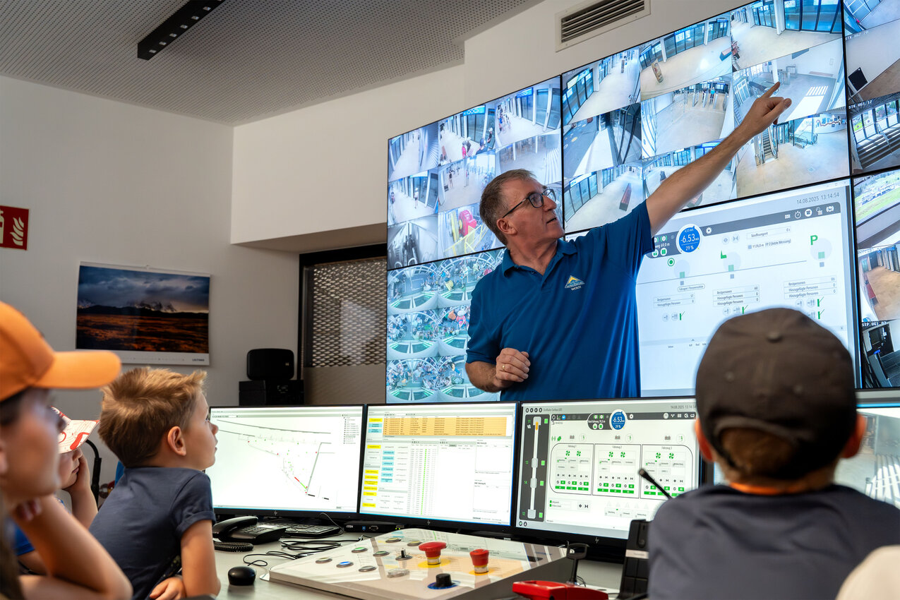 Los geht die Führung dann bei der U-Bahn-Station Seilbahn gleich nebenan: Hier bringt die U-Bahn im ca. 10-Minuten-Takt Gäste, die Richtung Berg gondeln wollen. „Diese U-Bahn hier ist schon die zweite Generation“, erklärt Wolfi. Die erste wurde im Jahr 1985 gebaut und lief bis 2019; viele der Teilnehmer erinnern sich auch noch an die alten Waggons. „Wisst ihr, was der große Vorteil der neuen U-Bahn ist?“, will Wolfi wissen. „Die barrierefreie Erreichbarkeit – das ist uns als Familiendestination besonders wichtig – und außerdem die erhöhte Förderkapazität: Bis zu 3.000 Personen pro Stunde können mit der neuen U-Bahn fahren! Damit kann es uns nicht mehr passieren, dass jemand nicht einsteigen darf.“