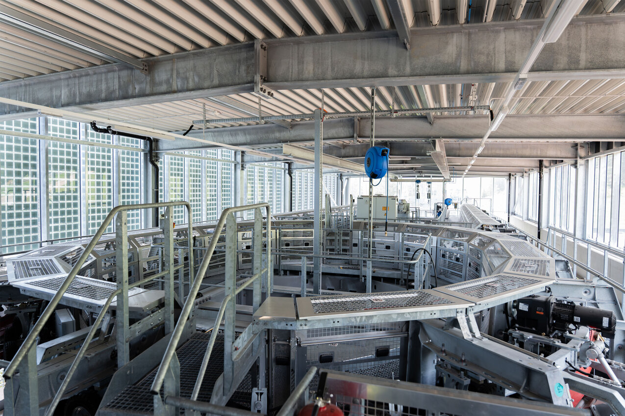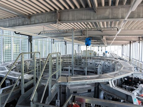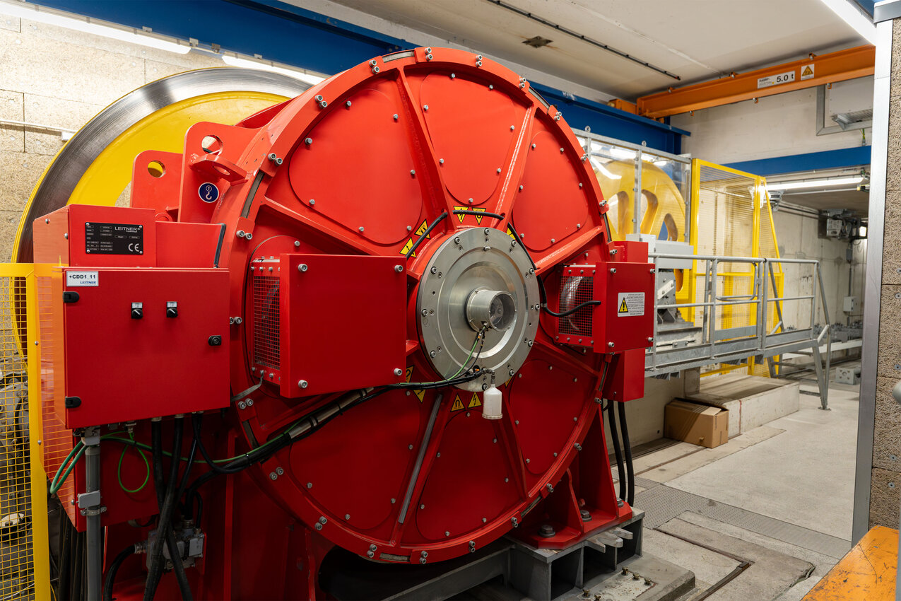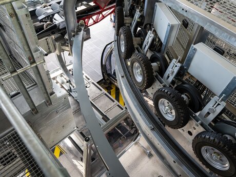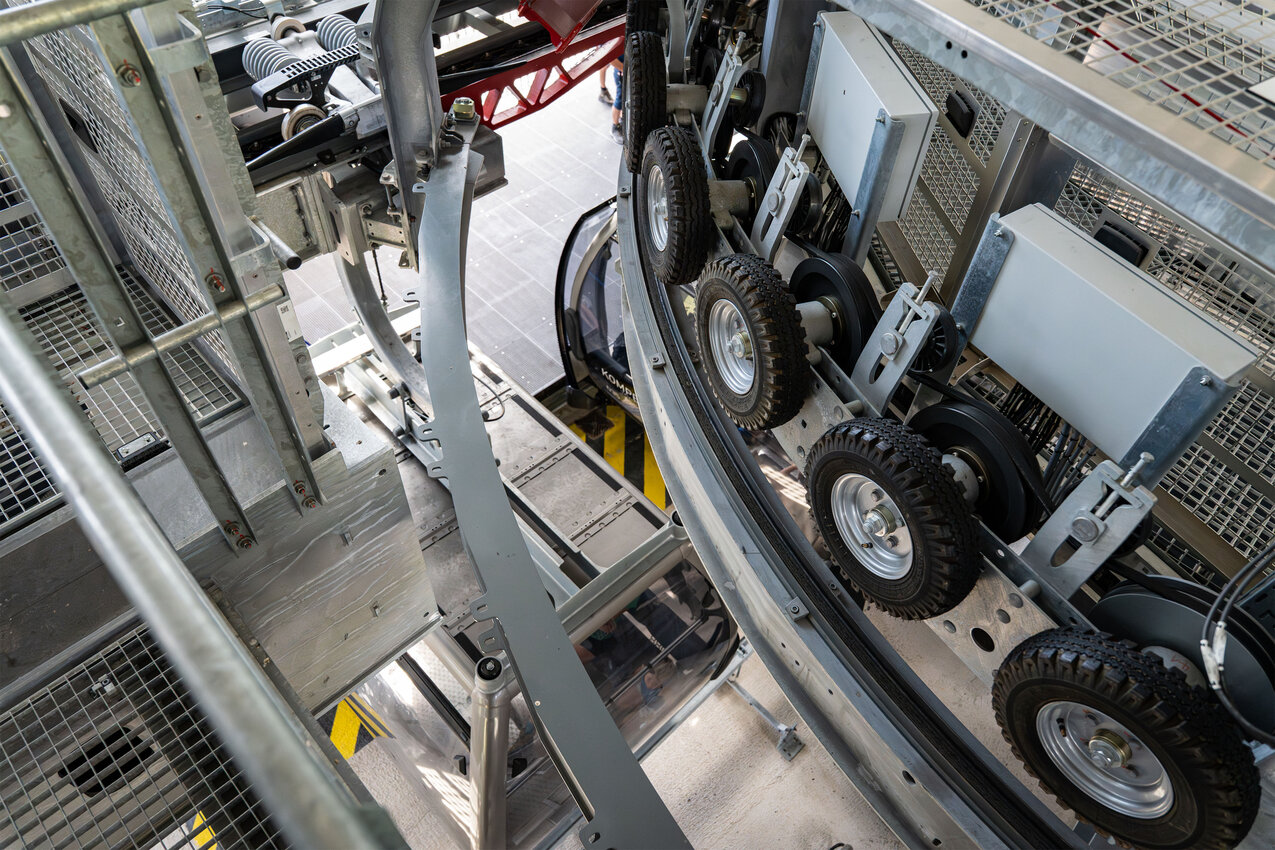 Nun wird extra für uns die Bahn kurz gestoppt und wir dürfen zwischen den Gondeln hindurchspazieren. Über eine Treppe gelangen wir in den oberen Bereich der Station– von hier sehen wir die kuppelbaren Gondeln direkt unter uns einfahren. Beeindruckend!