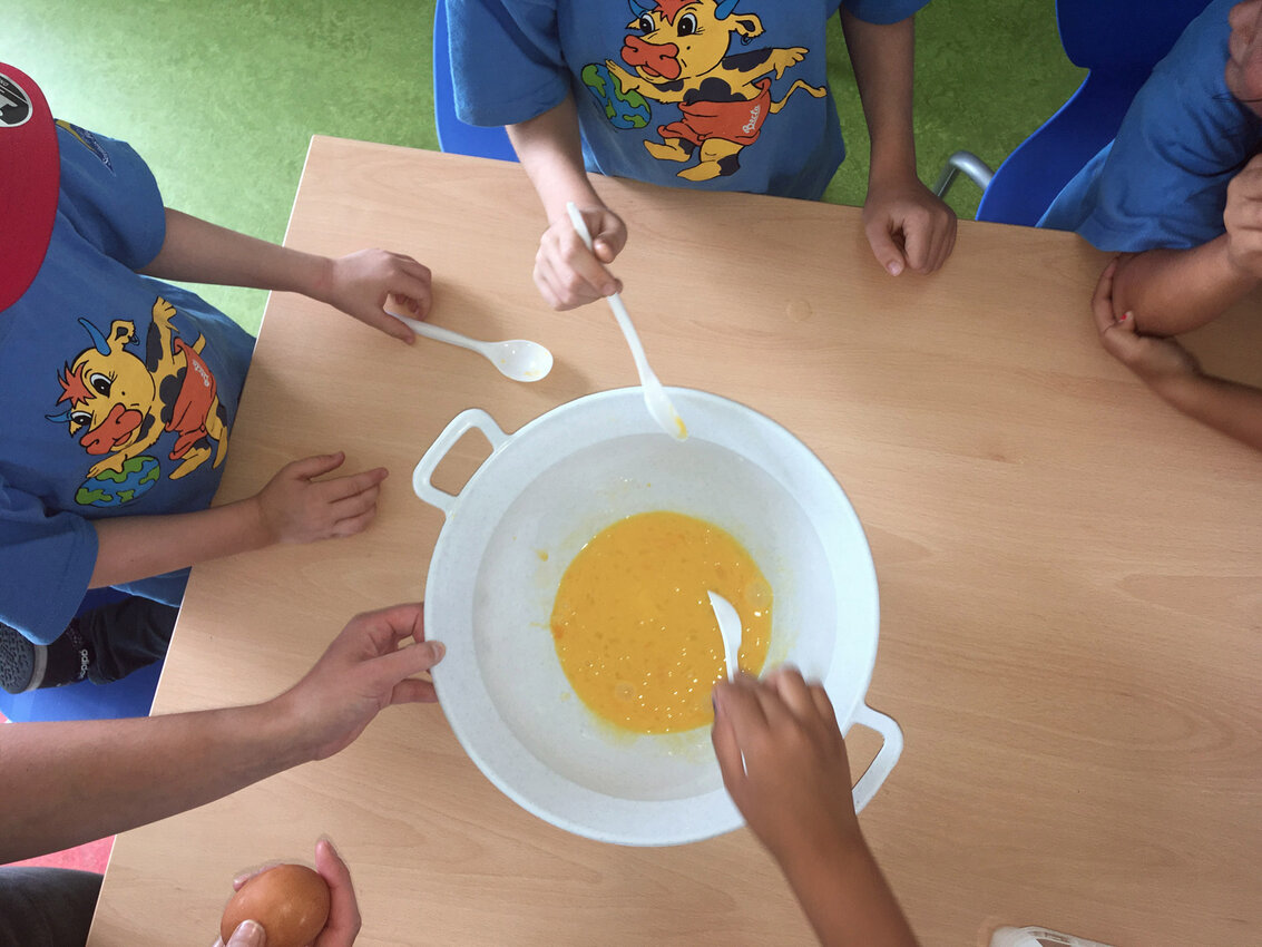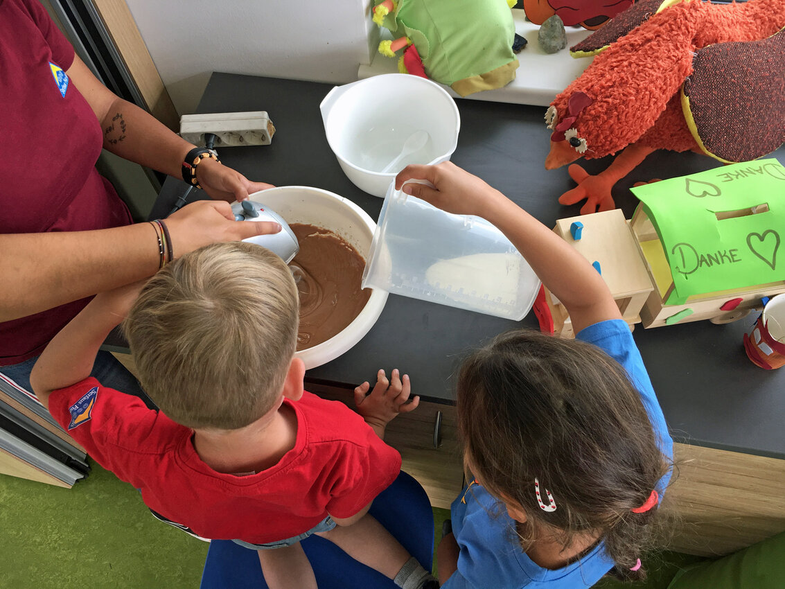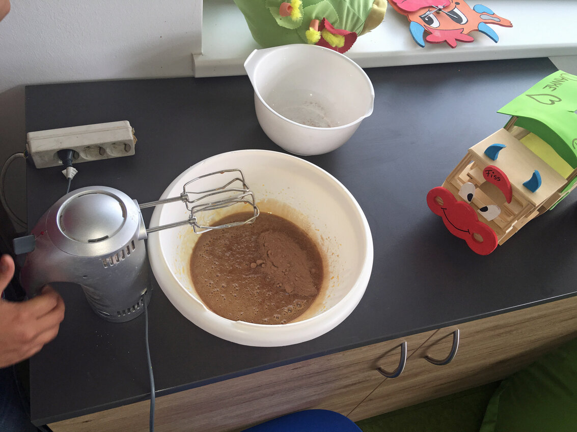Nach einer Mittagspause ging das bunte Programm sogleich weiter. Zunächst erklärten uns die Betreuerinnen Jasmine und Sissi, wofür die Eier benötigt werden, die wir zuvor vom Bauernhof mitgenommen hatten. Wir würden leckere Muffins damit backen. Die Kinder klatschten in die Hände und man konnte ihnen die Vorfreude deutlich ansehen. Nach und nach wurden die einzelnen Zutaten zusammengefügt und miteinander vermischt. Dabei durften alle Kinder abwechselnd ihre Backkünste unter Beweis stellen. Mit vollem Einsatz aller Beteiligten wurde ein schokoladiger Teig zubereitet. Zwischendurch durfte auch immer wieder probiert werden. Dabei wurde ich selbst wieder in meine Kindheit zurückversetzt, denn auch für mich gab es früher nichts Besseres als beim Backen vorab zu naschen.