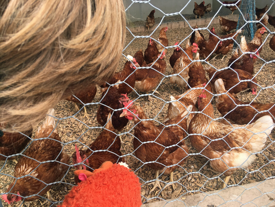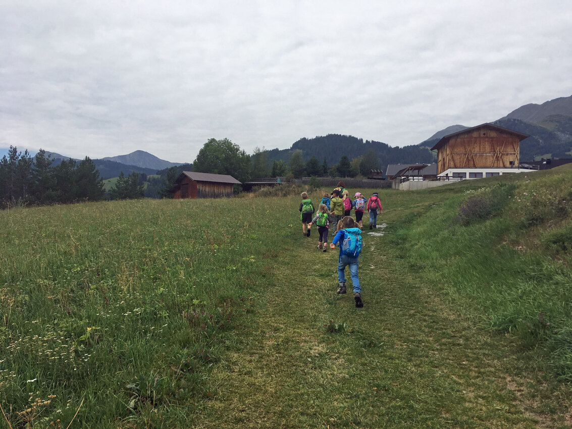 Nachdem wir alle Tiere gut versorgt wussten, marschierten wir weiter. Unser nächstes Ziel: ein weiterer Bauernhof, bei welchem wir bereits von zahlreichen gackernden Hühnern erwartet wurden. Auch die Schnabeltiere freuten sich sichtlich über den Besuch der Kinder, denn diese fütterten sie mit frisch gepflücktem Gras und Löwenzahn. Die Kinder bekamen gar nicht genug davon, den Hühnern zu essen zu geben und amüsierten sich prächtig bei all dem "Herumgegackere". Als wir uns wieder auf den Weg machten, durften wir noch einige frische Hühnereier - mittlerweile bestens als "Fisser Goggala" bekannt - mitnehmen, welche später noch eine ganz besondere Verwendung finden sollten.