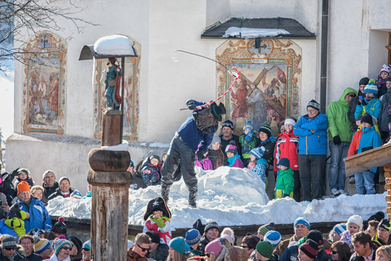 Als wir zurückkamen, gingen wir zum Baum und der Fuhrmann schnalzte. Das war das Kommando zum Losziehen. Vorne waren die Bärentreiber, Mohrelen und Schallner. Die Paarlen, die Holzer und Jäger zogen in der Mitte des Baumes und ganz hinten bremste der Schwoaftuifl. Die Hexen machten mit ihren Besen den Weg frei. Der Bajatzl und der Giggeler waren immer in Aktion. Die Zwerglen haxelten die Menschen mit Ihren Stöcken.