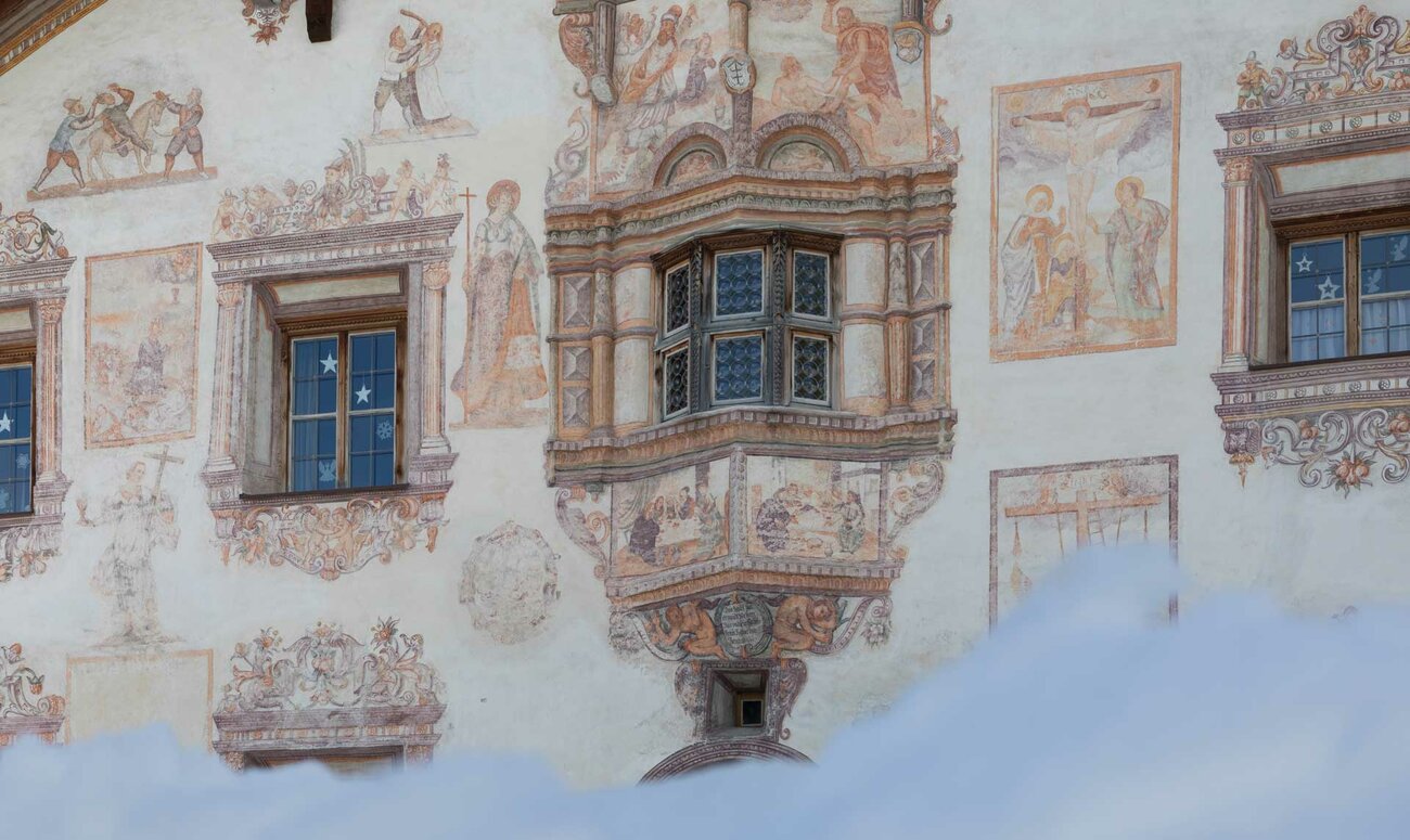 Einige Meter vom Rechelerhaus entfernt entbietet das Stockerhaus seine üppig mit Fresken bemalte Eingangsfront. Es hat vor allem durch seinen originellen Erker Eingang in die Architekturgeschichte des Oberen Gerichtes gefunden. Ich habe immer noch das Gefühl, als wenn das Haus zu seinen Betrachtern spricht. Sie sogar teilweise auf die Schaufel nimmt. Die vermutlich um 1626 in Secco-Technik ausgeführten Fresken bieten einen Querschnitt durch das Alte und Neue Testament. Aber nicht nur das: Auch lustige, ja geradezu arabeskenhafte Details zieren die Hausfront. Wie etwa links oben eine Darstellung eines Überfalls, bei dem ein Wegelagerer einen Reiter vom Ross zerrt. Der Mann rechts des Pferdes amüsiert sich jedoch. Ist es vielleicht die Darstellung des Sprichwortes: „Wer den Schaden hat muss sich um den Spott nicht sorgen“? Möglich aber auch die Weisheit, wonach Hochmut vor dem Fall komme.
