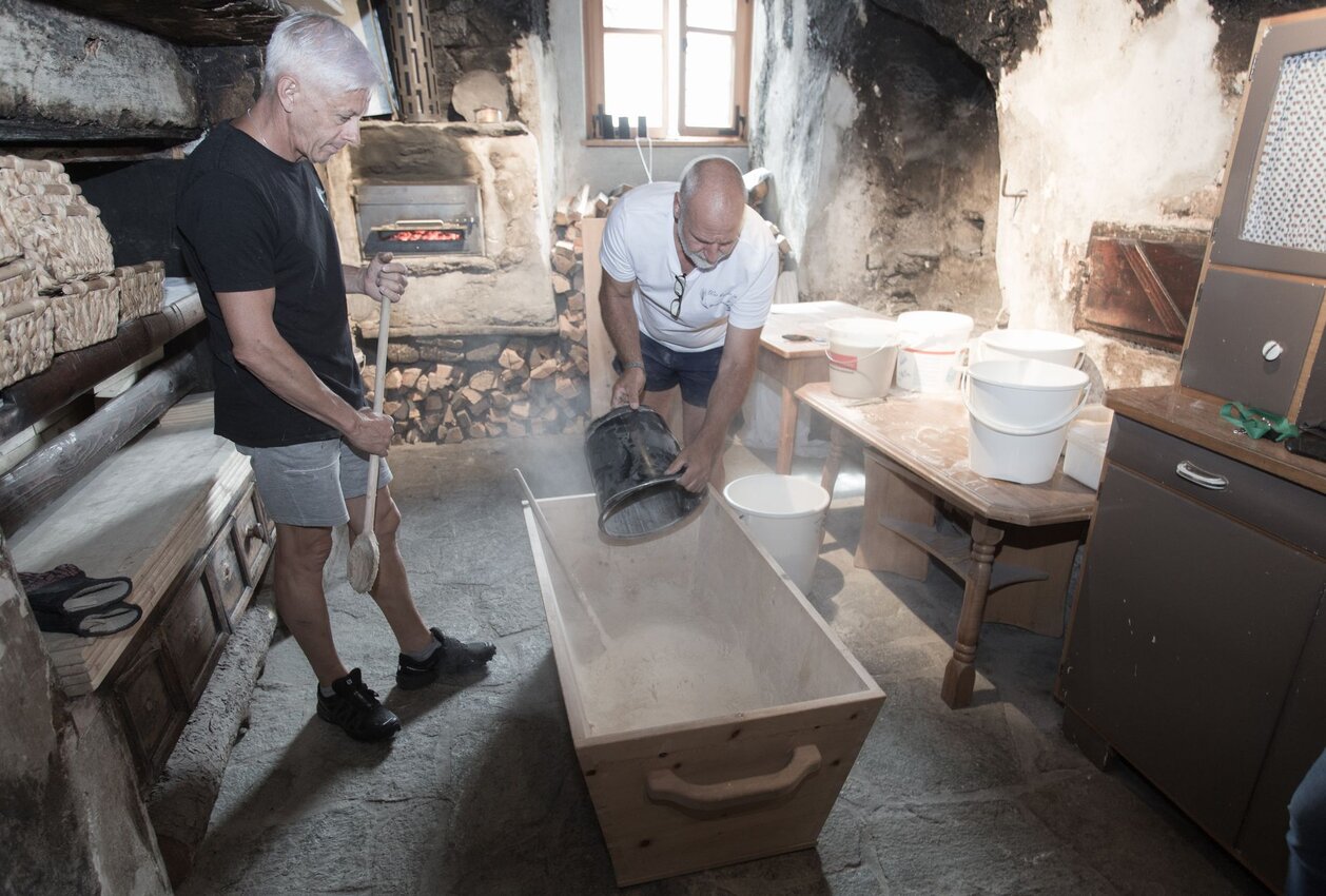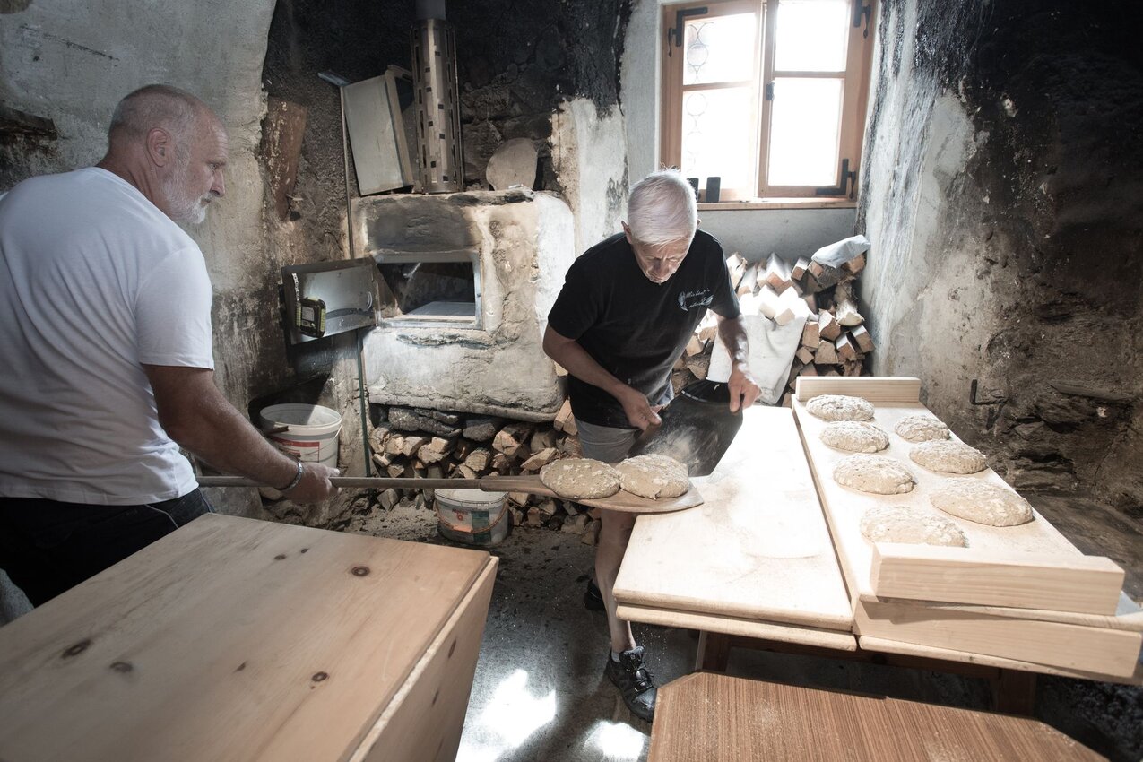 Neben dem Holzbackofen stellt der Trog, in dem der Teig zubereitet wird, einen ebenso integralen Bestandteil der „Hardware“ des Backvereins dar. Das Zirbenholz für dessen Anfertigung beim örtlichen Tischler spendierte Stefans Bruder Leo Netzer. Nicht nur optisch ist das fesche Teil ein Upgrade gegenüber Behältnissen aus Plastik: „Der Geschmack vom Brot wird dadurch anders – und besser!“, schwärmt Stefan. Das Ergebnis gibt dem Backverein Ladis Recht. Nicht nur duften die Brote famos, nein, natürlich schmecken sie auch köstlich, wozu selbstverständlich auch die Bio-Zutaten einen erheblichen Beitrag leisten, wie Ulrike gern bekräftigt. „Wenn man auf den Boden des Brotes klopft und es klingt hohl, ist es fertig!“, verrät sie außerdem. Vom ersten Biss ins Vinschgerl über das schwelgerische Kauen bis hin zum wohligen Wonnegefühl im Magen – ein echter Hochgenuss, dieses Brot aus dem Holzbackofen!