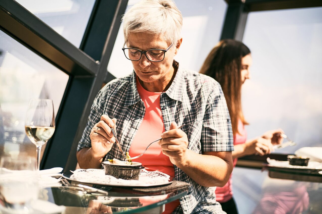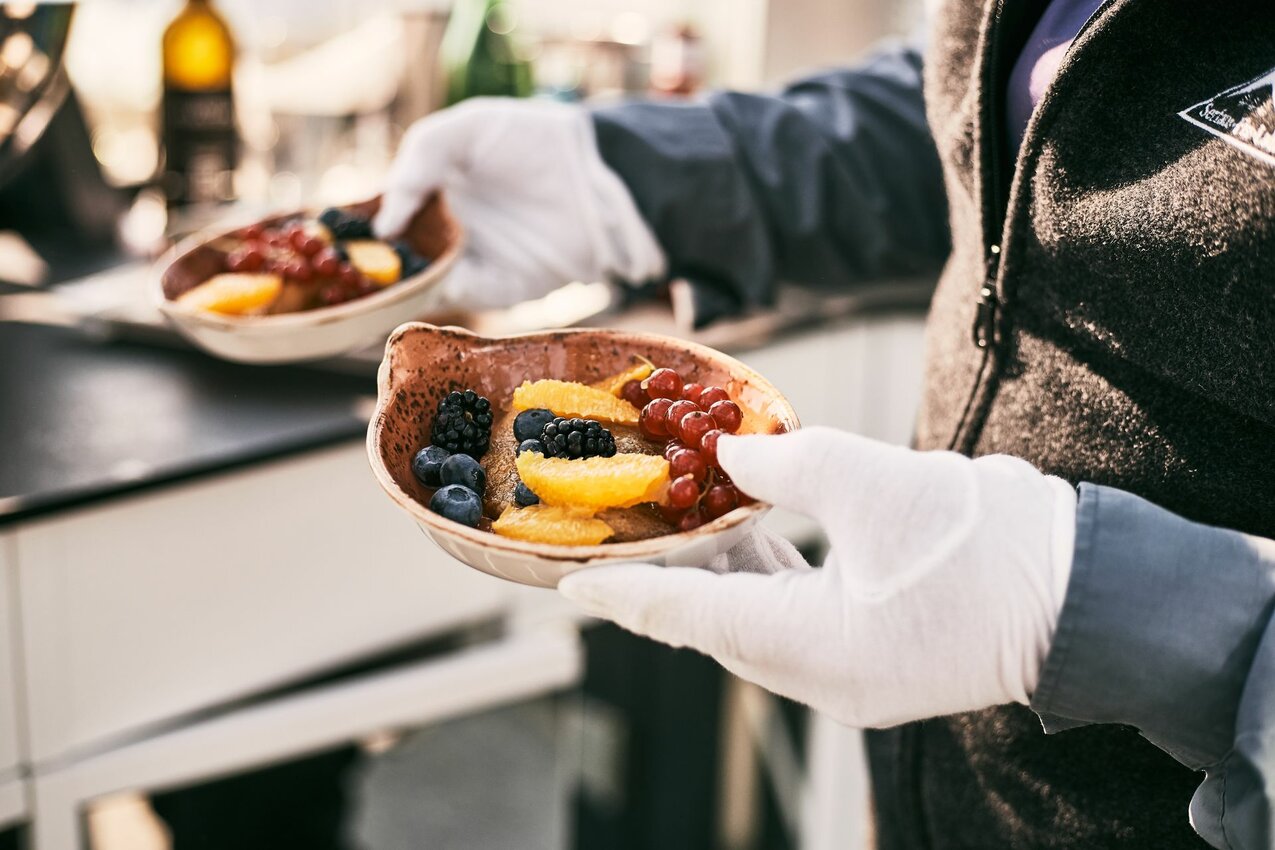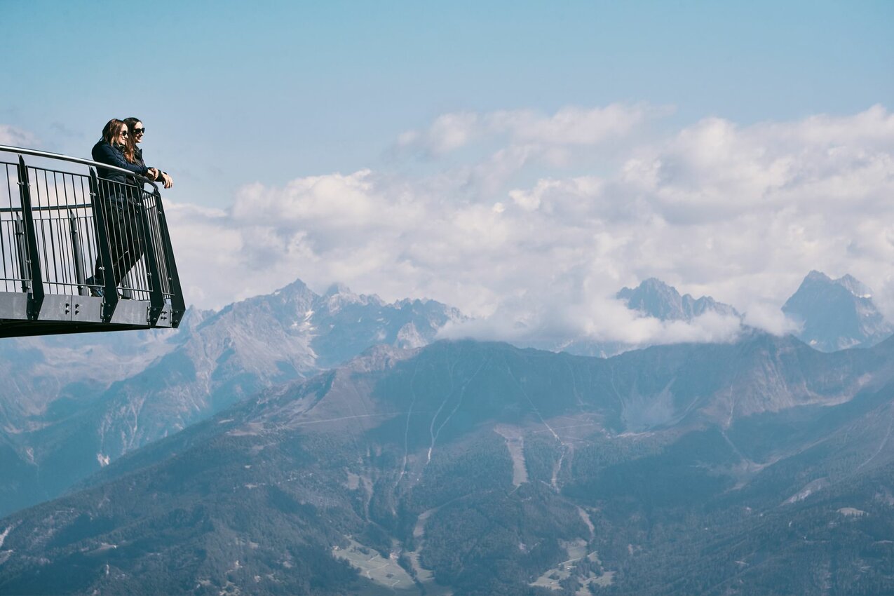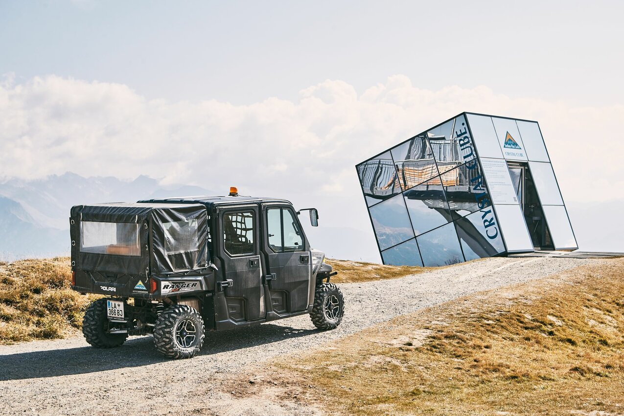 Mit der Schönjochbahn überwinden wir kurzerhand 1.000 Höhenmeter und steigen erwartungsvoll am FISSER JOCH aus. Die Sonne strahlt vom Himmel und die klare Septemberluft lässt uns richtig durchatmen. Wie in einem Hollywood-Blockbuster kommen wir uns beim Start in unser Kulinarik-Abenteuer "Luxury Lunch" vor. Bei der Bergstation werden wir von einem gut gekleideten Herrn abgeholt. Wir folgen unauffällig und mit knurrenden Mägen. Unser schwarzes FLUCHTAUTO IN DEN GENUSS steht bereits vor dem Panoramarestaurant BergDiamant: eine Mischung aus Quad und Geländewagen. Es scheint alles überwinden zu können – 200 Höhenmeter liegen vor uns. Schwungvoll, ein wenig durchgerüttelt, aber heil kommen wir nach wenigen Fahrminuten oben am Zwölferkopf an. Die Tür wird uns höflich geöffnet und wir schreiten erwartungsvoll zu unserem außergewöhnlichen Minirestaurant. Die Kulisse hier oben ist schon mal FILMVERDÄCHTIG. Schnell stellt sich heraus: Peter ist weniger ein waghalsiger Agent, sondern vielmehr ein aufmerksamer Kellner, der uns in den nächsten Mittagsstunden verwöhnen wird.