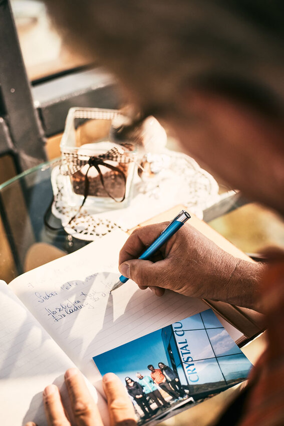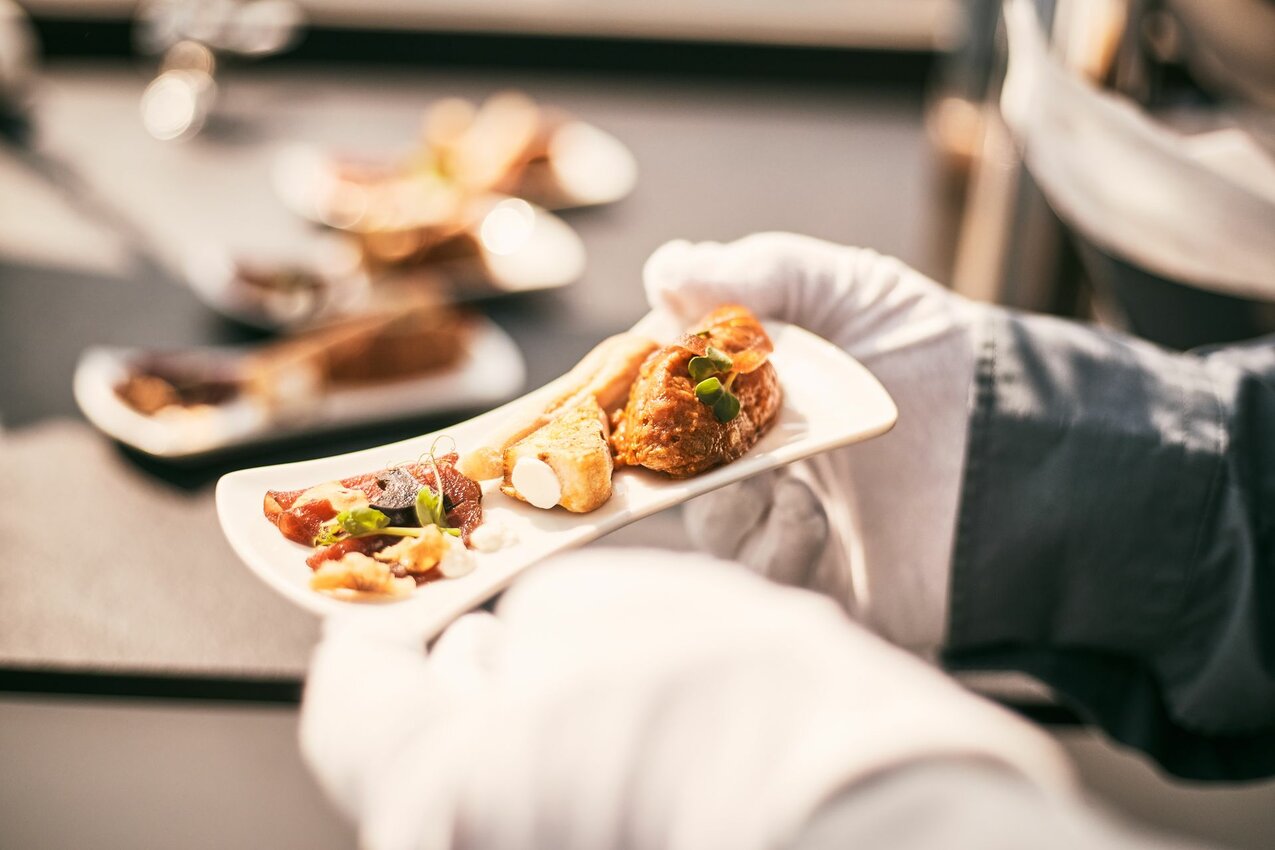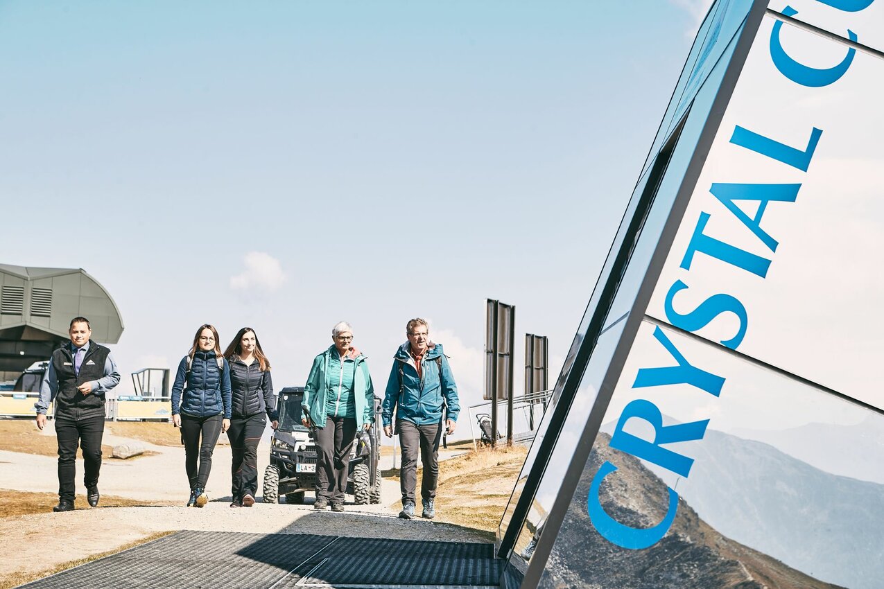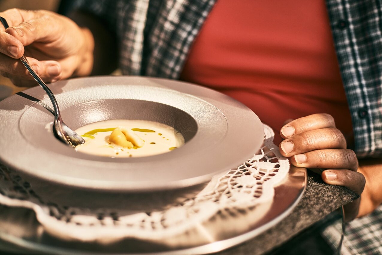 Mit der Schönjochbahn überwinden wir kurzerhand 1.000 Höhenmeter und steigen erwartungsvoll am FISSER JOCH aus. Die Sonne strahlt vom Himmel und die klare Septemberluft lässt uns richtig durchatmen. Wie in einem Hollywood-Blockbuster kommen wir uns beim Start in unser Kulinarik-Abenteuer "Luxury Lunch" vor. Bei der Bergstation werden wir von einem gut gekleideten Herrn abgeholt. Wir folgen unauffällig und mit knurrenden Mägen. Unser schwarzes FLUCHTAUTO IN DEN GENUSS steht bereits vor dem Panoramarestaurant BergDiamant: eine Mischung aus Quad und Geländewagen. Es scheint alles überwinden zu können – 200 Höhenmeter liegen vor uns. Schwungvoll, ein wenig durchgerüttelt, aber heil kommen wir nach wenigen Fahrminuten oben am Zwölferkopf an. Die Tür wird uns höflich geöffnet und wir schreiten erwartungsvoll zu unserem außergewöhnlichen Minirestaurant. Die Kulisse hier oben ist schon mal FILMVERDÄCHTIG. Schnell stellt sich heraus: Peter ist weniger ein waghalsiger Agent, sondern vielmehr ein aufmerksamer Kellner, der uns in den nächsten Mittagsstunden verwöhnen wird.