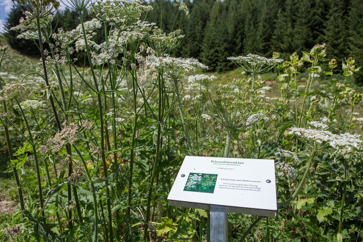 Alle Gewächse, die entlang des Weges wachsen, wurden nicht gepflanzt. Wildwachsende Kräuter sind widerstandsfähiger als gepflanzte und werden deshalb in den Wäldern und Wiesen rund um Serfaus-Fiss-Ladis nicht so schnell verschwinden.
