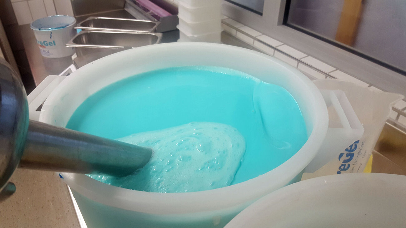 Meine Frage, welche Eissorten am besten über die Theke gehen, wurde standardgemäß beantwortet: „Die Klassiker wie Vanille, Schoko und Erdbeere werden am meisten gegessen. Diese werden auch für die Eisbecher am häufigsten benötigt. Bei den Kindern ist unser Murmlieis sehr beliebt.“ Während wir uns über die verkauften Mengen unterhalten, bereitet der Eismacher nebenbei alles für die heutige Produktion vor. Das begehrte Murmlieis steht auf seiner der To-do-Liste.