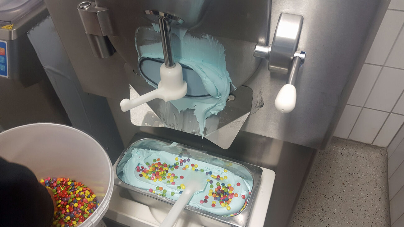 Als Vladi das Eis Schicht für Schicht aus der Maschine rinnen lässt und dieses noch mit Smarties garniert (das Auge isst ja mit), kam der Satz, auf welchen ich mich schon während meines ganzen Besuches freute: „Jetzt müssen wir probieren, ob es schmeckt." Wir nehmen beide einen Löffel, lassen uns das eben produzierte Murmlieis auf der Zunge zergehen und sind uns schnell einig: Das Eis hat den Qualitätscheck bestanden!
