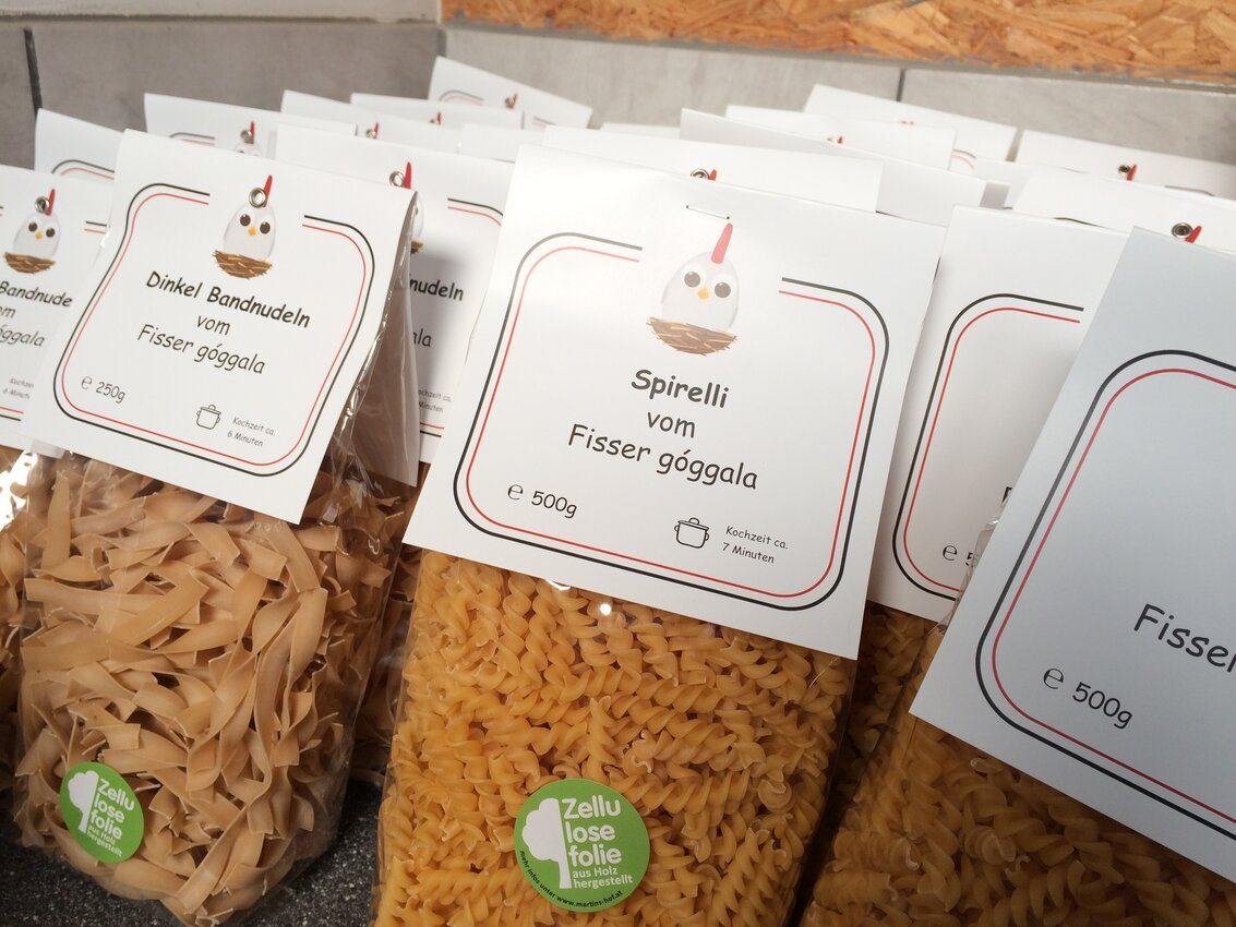 Der Likör und die Nudeln werden in einer kleinen Manufaktur in Buch bei Lauterach in Vorarlberg produziert. „Der Martinshof ist eigentlich ein Biobauernbetrieb, nebenher hat sich der Bauer auf die Herstellung von Eierprodukten spezialisiert,“ erzählt uns Florian auf die Frage, wo er seine Produkte herstellen lässt. Außerdem bieten sie in ihrem Hofladen ihre selbst angebauten Kartoffeln und die wiederentdeckte Fisser Imperial Gerste zum Verkauf an. Aus der urwüchsigen Gerste lässt sich beispielsweise eine äußerst leckere Suppeneinlage namens Fisser Imperial Gersten-Krusteln oder die legendäre Gerstelsuppe zaubern. Außerdem bieten sie im Sommer auf Vorbestellung leckere Grillhendl an.