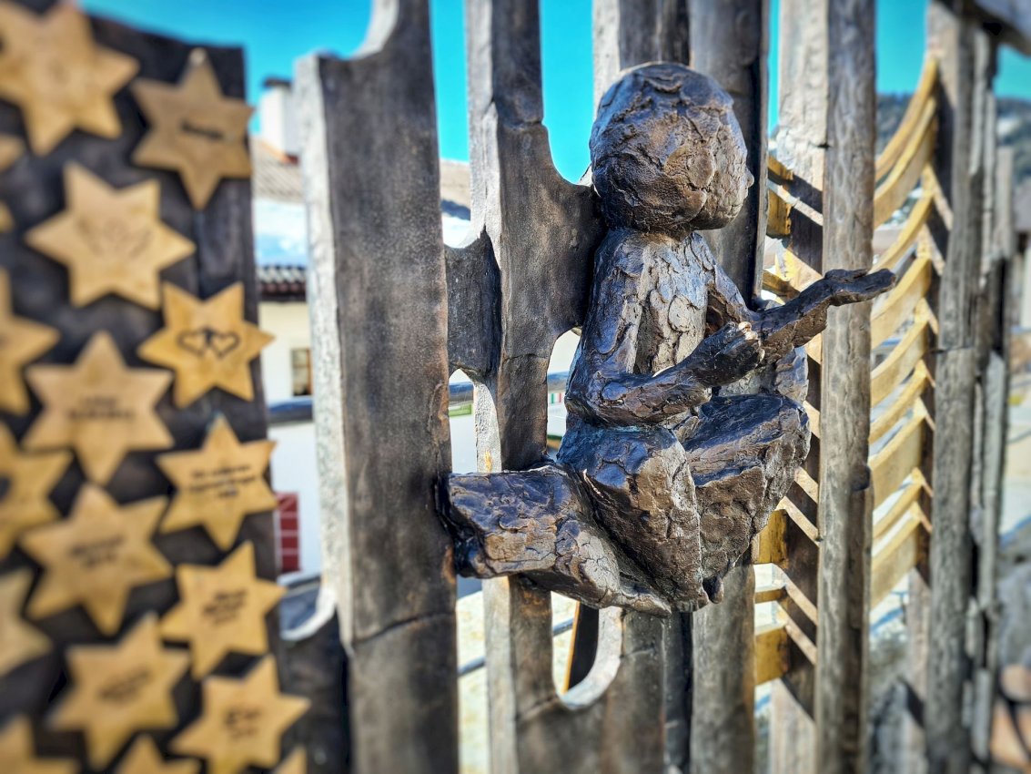 Bei der Gestaltung des Grabes hat uns der Fisser Bildhauer Siegfried Josef Krismer tatkräftig unterstützt. Er war jahrelang auch Obmann der Zweigstelle des Familienverbandes Fiss. Er hat eine äußerst geschickte Hand für Skulpturen, was er bereits mehrmals eindrucksvoll bei Kunst am Berg dargeboten hat. Seine Erklärung zur Darstellung: Gott hat uns Jesus als Kind geschenkt. Es ist offen für uns Menschen, auch im Leid, das Eltern in einem totgeborenen Kind erleben. Es weist auch hin zum Kreuz, das er für uns auf sich nahm. Aber vor allem beinhaltet das Bronzegrab den Hinweis auf die Auferstehung im Symbol der Strahlenringe. Auf der linken Seite erinnern die Sterne an die vorzeitig und totgeborenen Kinder. Wir gedenken auch ihrer Seele, die jeder Mensch von der Empfängnis an von Gott erhält.