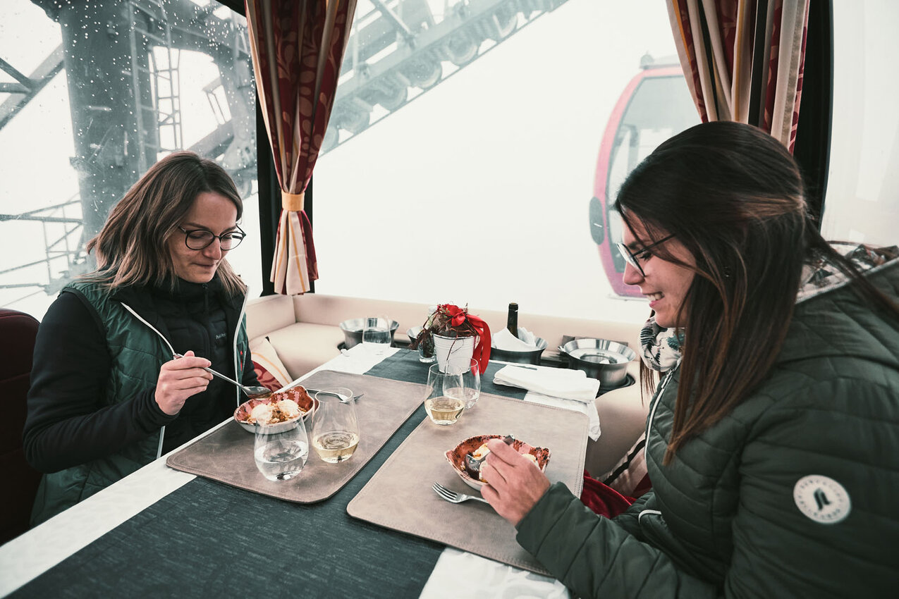 Die nächsten 4 GÄNGE wurden uns in trauter Zweisamkeit, umgeben von einem 360-Grad-Rundumblick auf die Berge, gereicht. Das Angebot ist aber auch für bis zu 4 Erwachsene und 2 Kinder buchbar. Der Tisch war hübsch gedeckt, die Sitzbänke gepolstert, sogar Vorhänge zierten die Kapselecken. Damit auch bei kälteren Temperaturen der Besuch zum Erlebnis wird, wurden uns Wärmflaschen zum Draufsitzen gereicht. Das kleinste Restaurant der Welt war ganz schön gemütlich. An der Bergstation wurden die Speisen serviert, an der Mittelstation das Geschirr wieder abgeräumt. Übrig blieb nichts. Gähnende TELLER-LEERE und volle Bäuche.