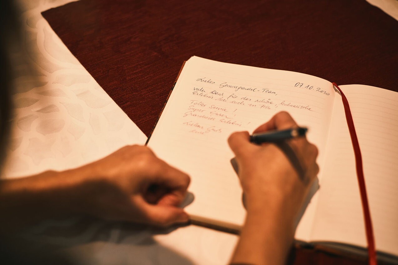Glücklich und satt ließen wir den TAG IN DER GONDEL Revue passieren und schrieben noch ein paar Zeilen in das Gästebuch. Ein kleines ÜBERRASCHUNGS-PRÄSENT bekamen wir von unserem Kellner auch noch überreicht. "Als kleine Aufmerksamkeit bekommen all unsere Genussgondler immer ein Geschenk - eine Rose aus der lokalen Gärtnerei, etwas Selbstgemachtes aus unserer Küche oder Spezialitäten aus der Region", lächelte Etienne freundlich, als er uns die schwarzen Täschchen mit silberner Aufschrift überreichte.