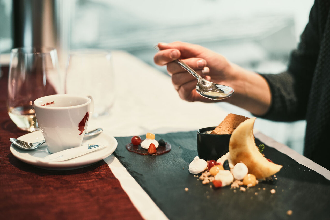 Zurück auf 2.436 m, stiegen wir dann aus unserer schwarzen Gondel aus und schritten zurück in unsere Ecke. Eine weitere süße VERFÜHRUNG, der 6. Gang, wurde uns hübsch serviert. Der letzte Gang kann auf Wunsch auch in der Gondel eingenommen werden.