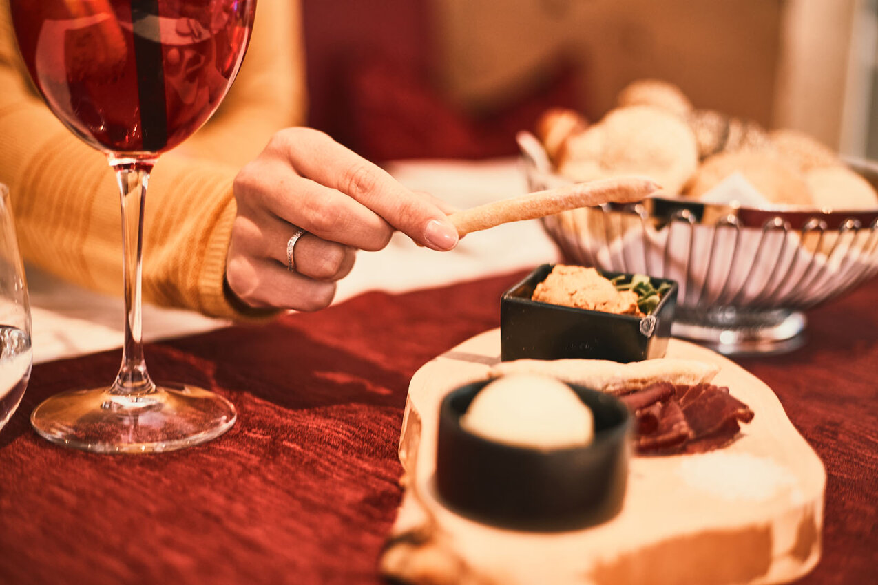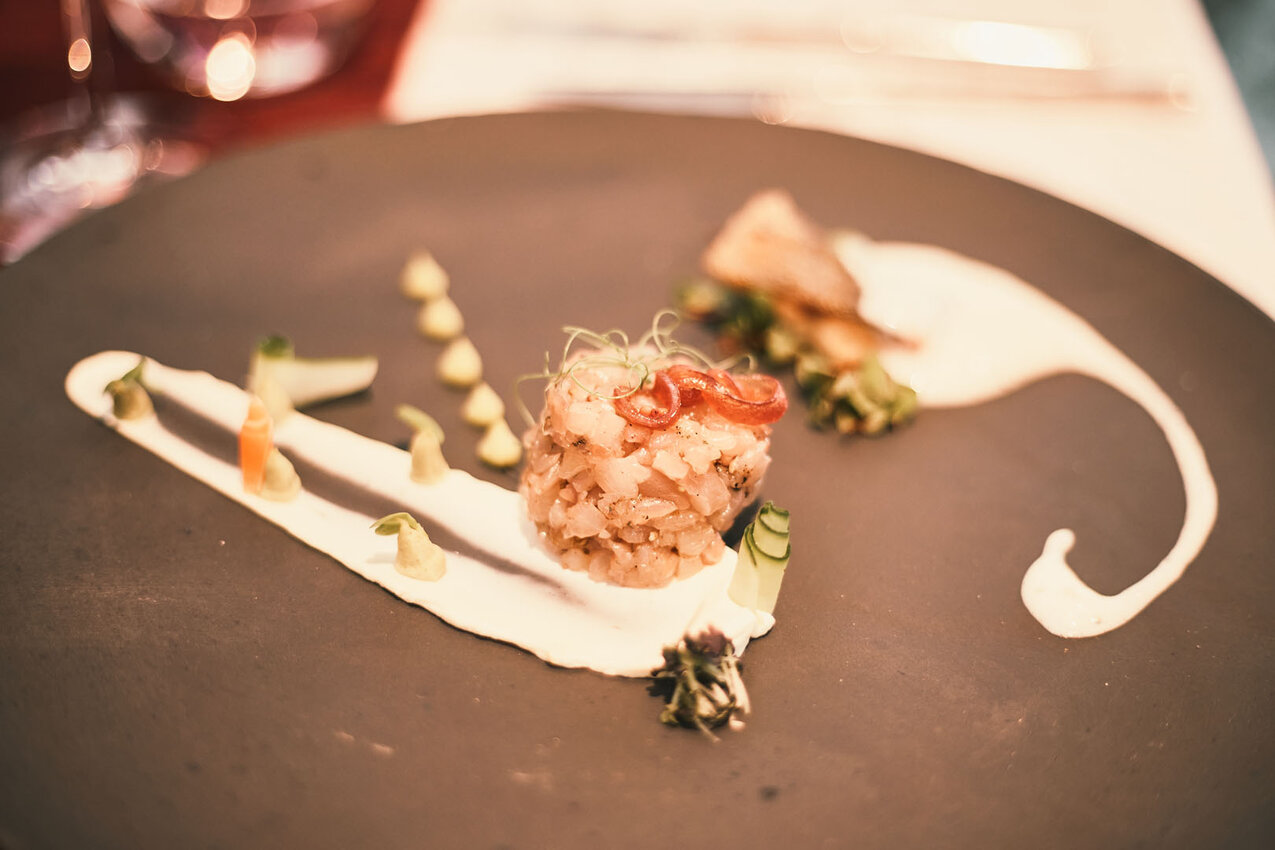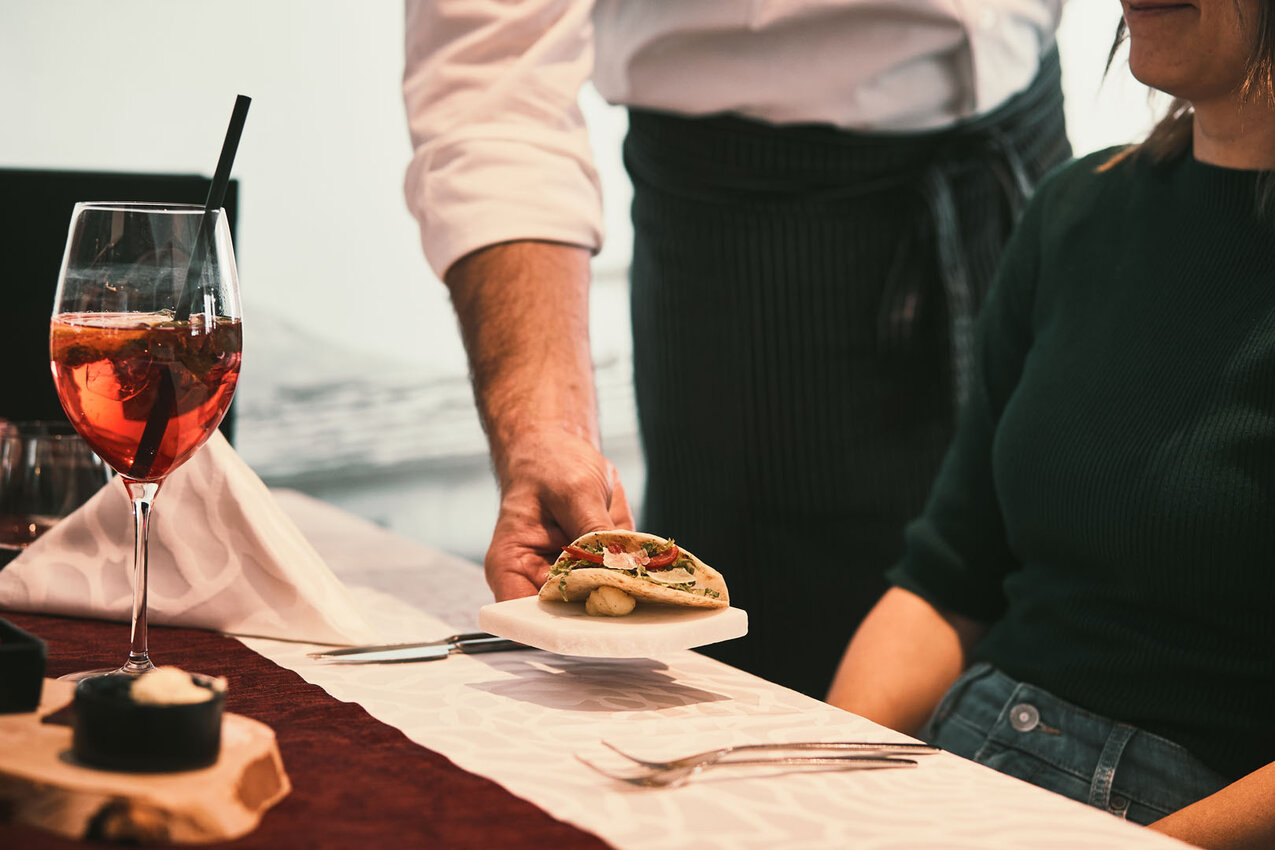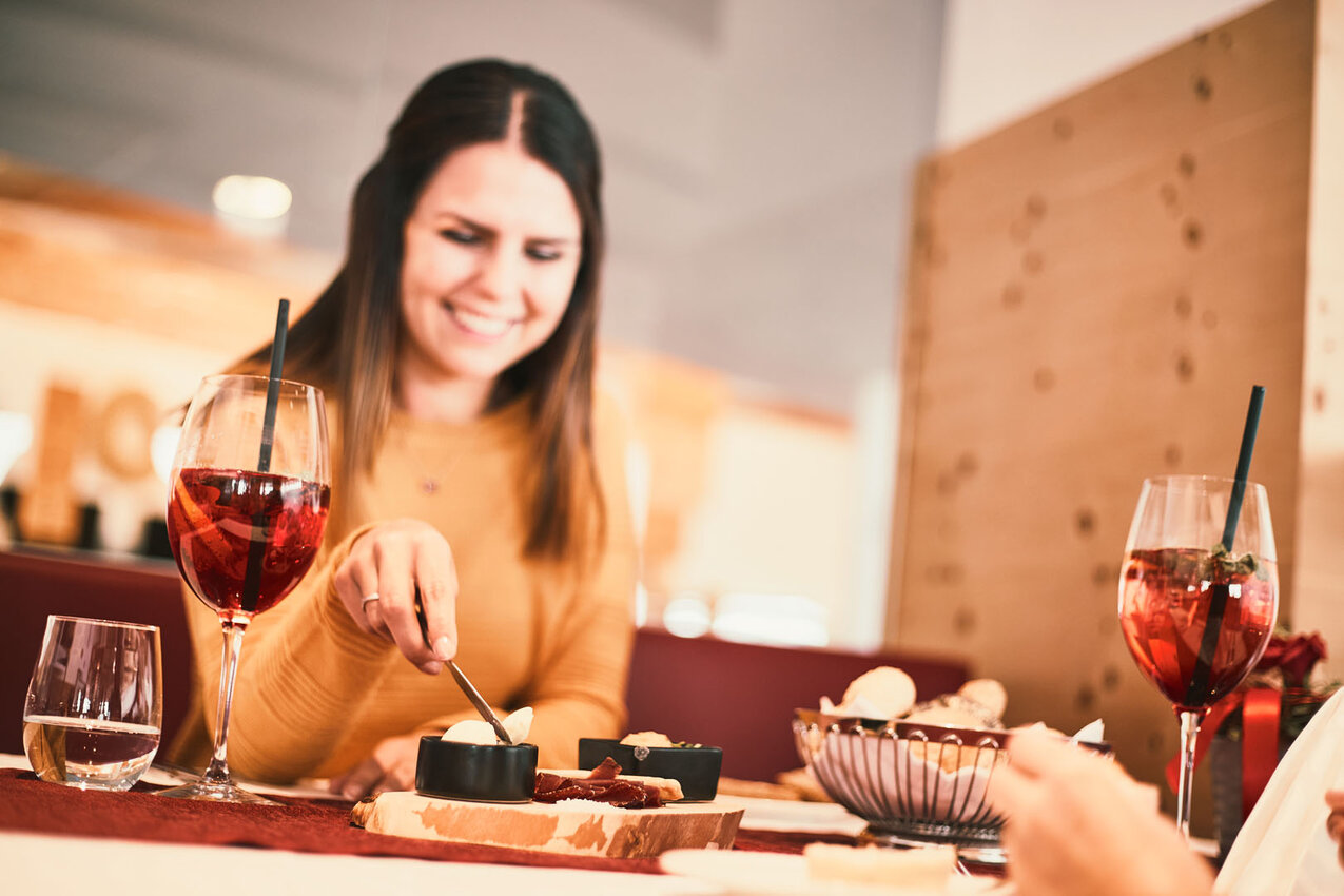 Mit der roten Schönjochbahn gondelten wir Anfang Oktober 1.000 Höhenmeter rauf aufs Fisser Joch. Auf 2.436 Meter wurden wir bereits vom schick gekleideten Gondel-Kellner, im Panoramarestaurant BergDiamant empfangen. In der exklusiven Genussgondel-Ecke schlürften wir wenige Momente später genüsslich unseren APERITIF: ein erfrischendes Preiselbeergetränk namens „Grantaspritz“. Dazu wurde uns ein AMUSE GUEULE auf einem Holzbrettchen gereicht: Brot, Aufstriche, Alpenbutter und geräucherter Hirschschinken. Darauf folgte der erste Gang: Vom Forellen-Tatar träume ich immer noch! Nach dem leichten Gaumenschmaus nahmen wir dann voller Erwartungen in unserem rotierenden Mini-Restaurant Platz, das in der Bergstation bereits auf seine Gäste wartete.