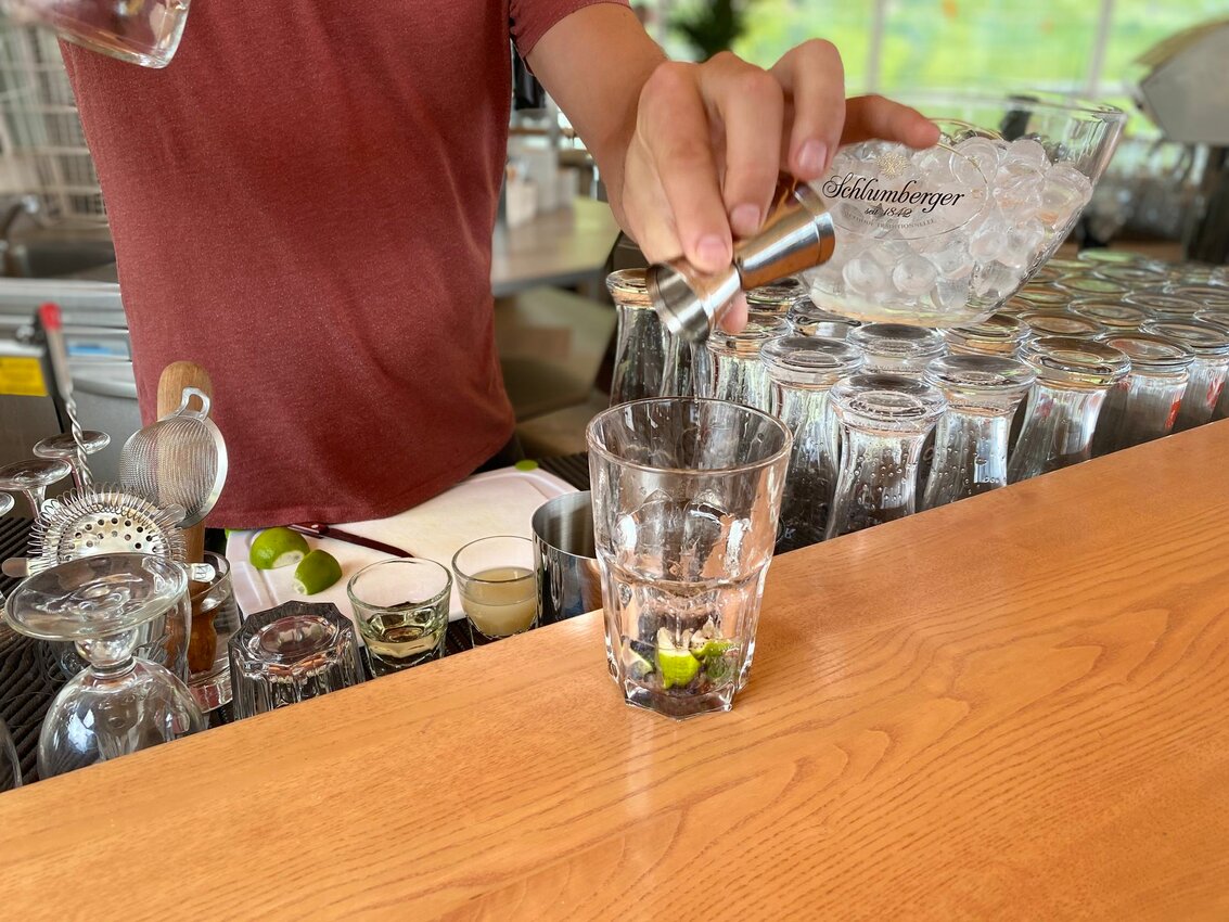 Die Limette vierteln und den weißen Strunk rausschneiden. Danach mit dem Honig im Glas leicht „anstösseln“, dass der Saft der Limette austritt. Ca. 10 Moosbeeren und 2-3 Minzblätter hinzugeben und ebenfalls leicht anstösseln.
