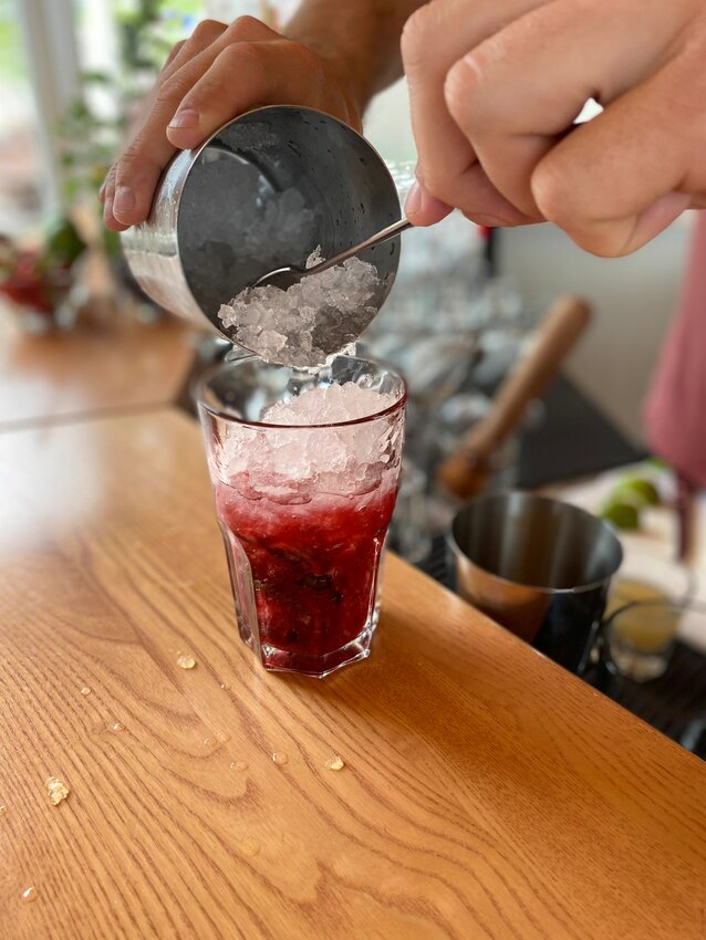 Wenn alles verrührt ist, leicht mit Crushed Ice und mit ca. 10 cl Sodawasser auffüllen.