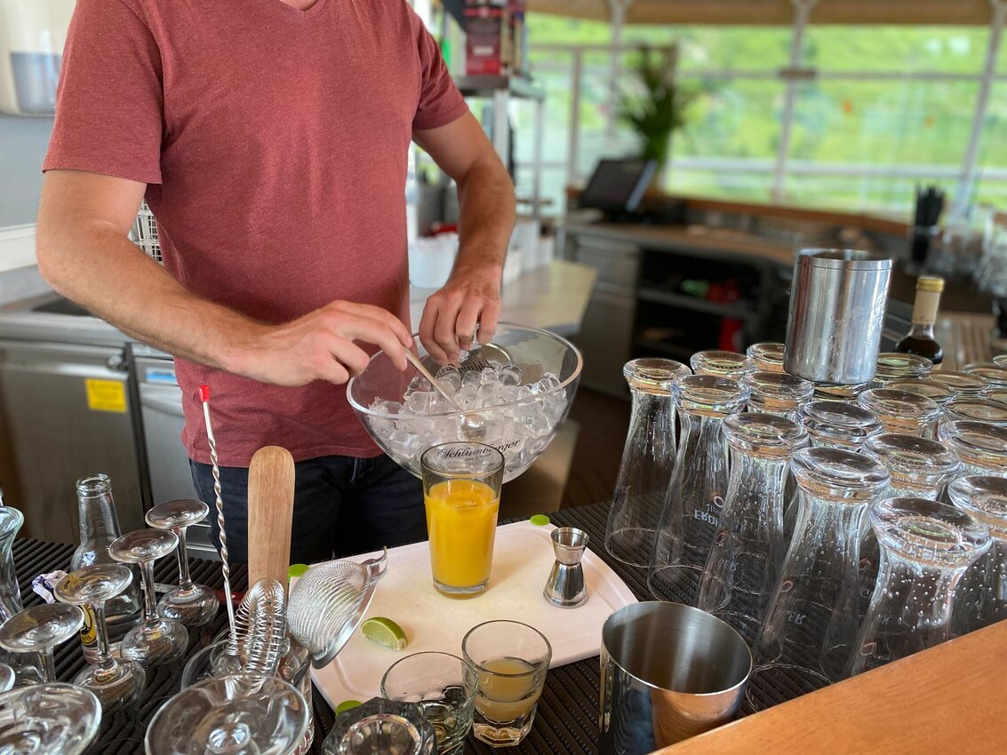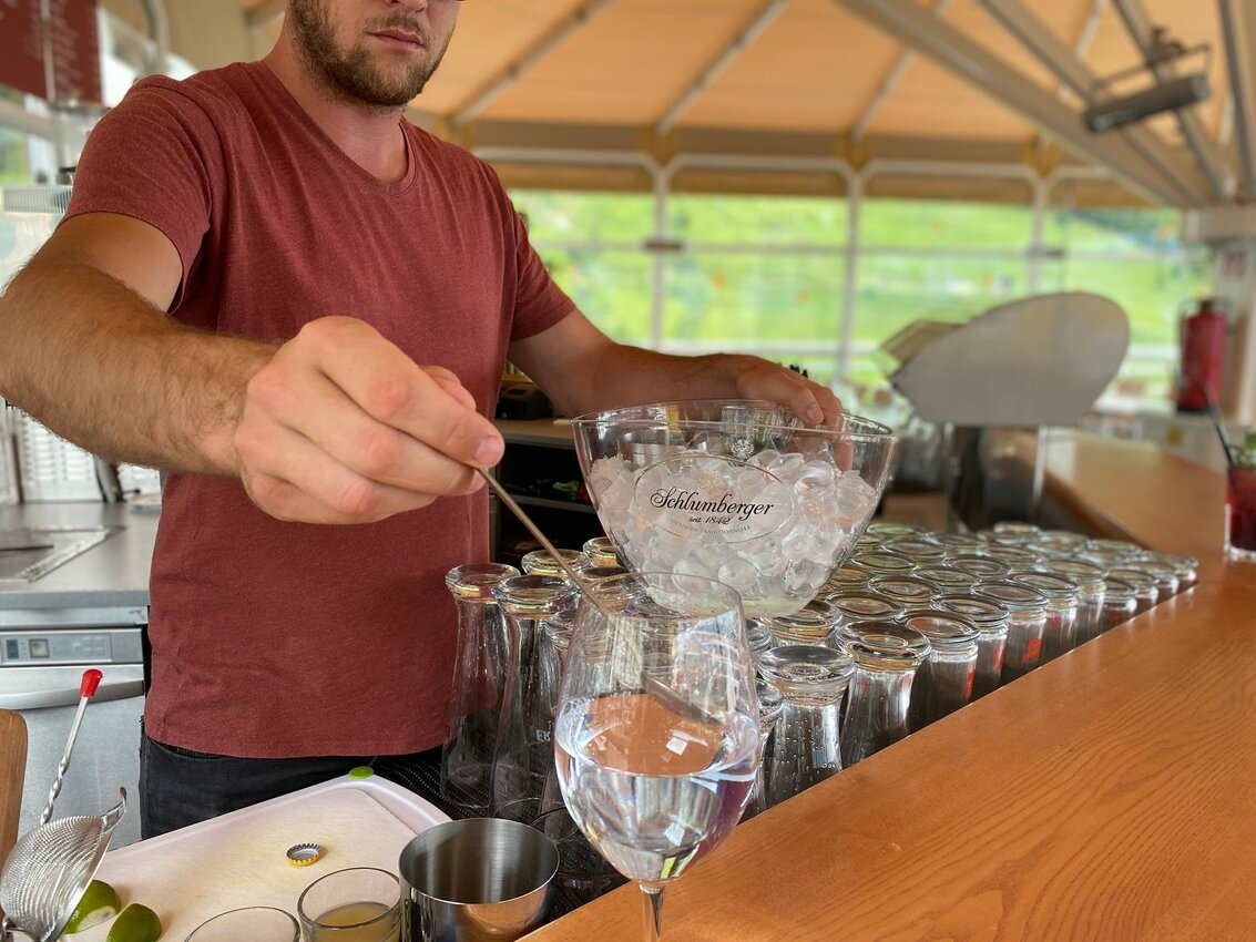 Dann den Wodka und den Granta Spritz hinzugeben und mit etwas Crushed Ice das Ganze verrühren.