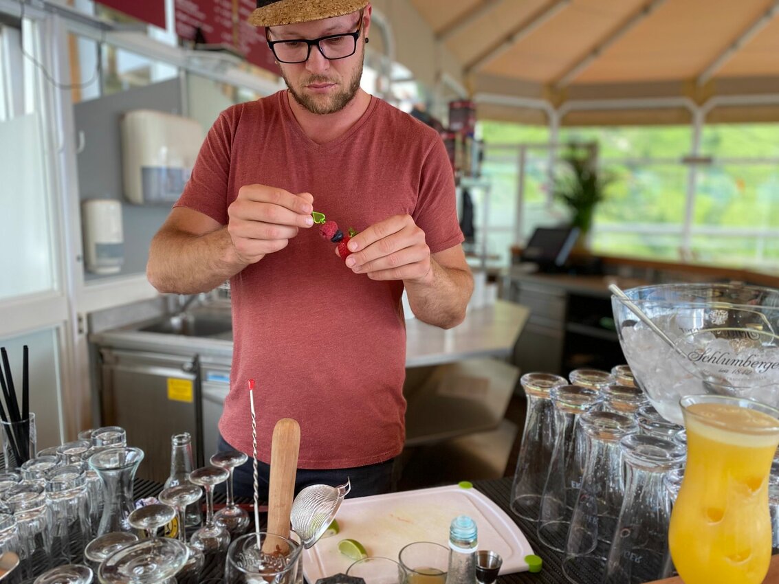 Dann alles zusammen in ein mit Eiswürfeln befülltes Glas geben und den Curacao-Sirup am Glasrand hineinlaufen lassen. Bei der Deko sind der Fantasie natürlich keine Grenzen gesetzt.