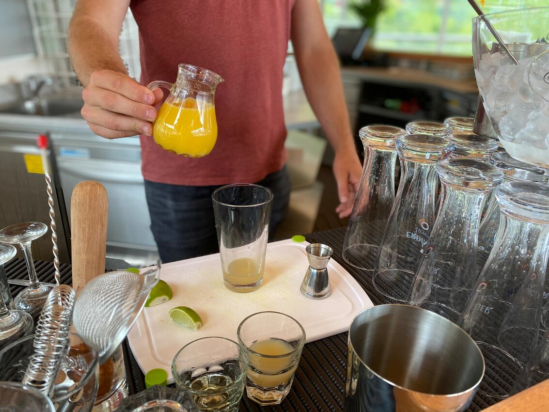 Den Limettensaft, den Holundersirup und den Orangensaft zusammen in einen Shaker geben, mit Eis auffüllen und dann alles zusammen kräftig shaken.