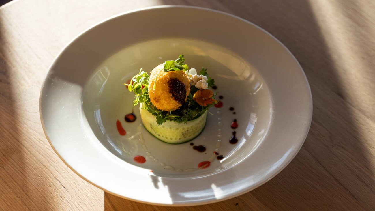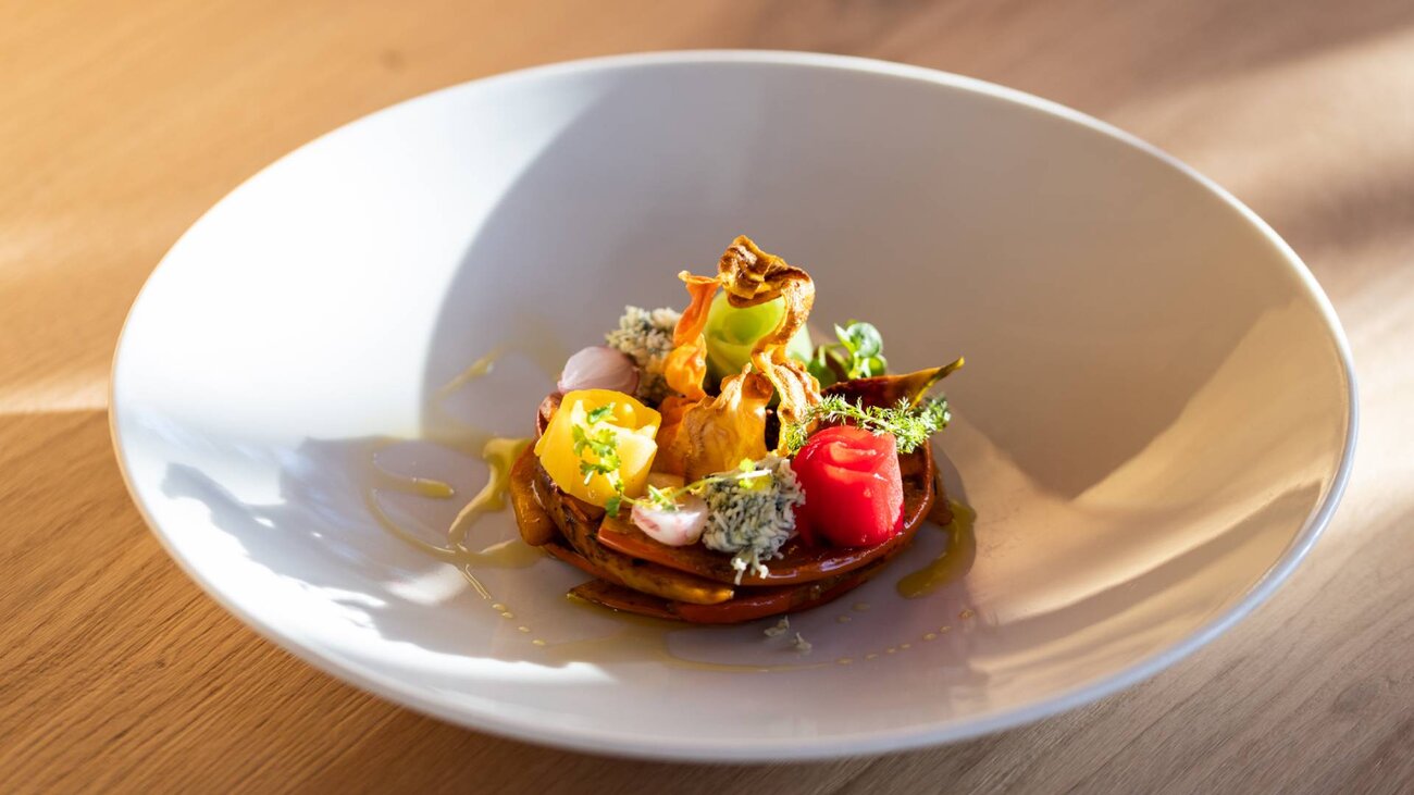 War die Grüne Haube lange ein Qualitätsmerkmal für ausschließlich vegetarische Küche, darf mittlerweile auch Fleisch und Fisch aus nachhaltiger, bio-zertifizierter Zucht verwendet werden. Kernelement der Grünen Haube bleiben aber vollwertige vegetarische Gerichte, dazu muss der Betrieb auch Optionen für (Gluten-)Allergiker bieten. „Früher waren vegetarische Optionen oft ganz einfach die Beilagen. Das ist aber schon lange nicht mehr zeitgemäß.“ Wie einfallsreich und geschmackvoll vegetarische Haubenküche sein kann, zeigen die Gerichte, die das Küchenteam im Chesa Monte täglich aus der Küche schickt.