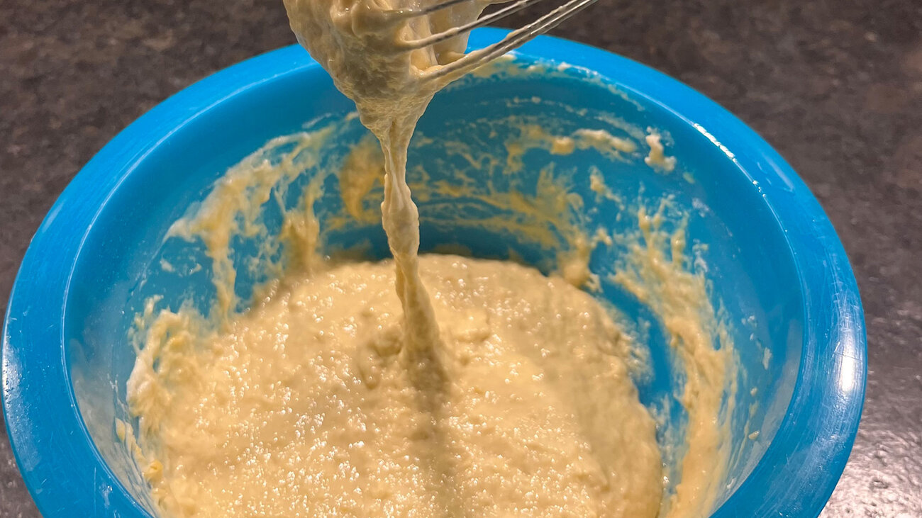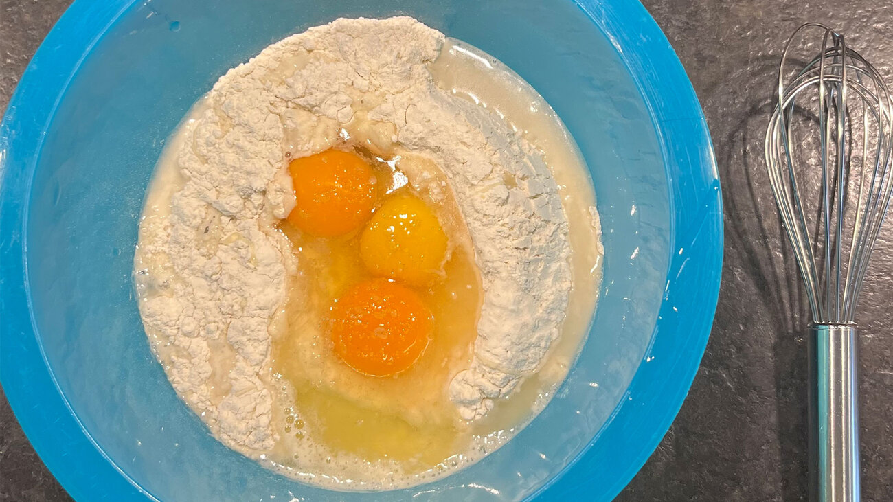 Mehl, Wasser, Eier und Salz zu einem Teig verarbeiten und kurz glattrühren. Der Teig sollte dick vom Löffel reißen. Darunter versteht man, dass der Teig zäh vom Kochlöffel tropft.