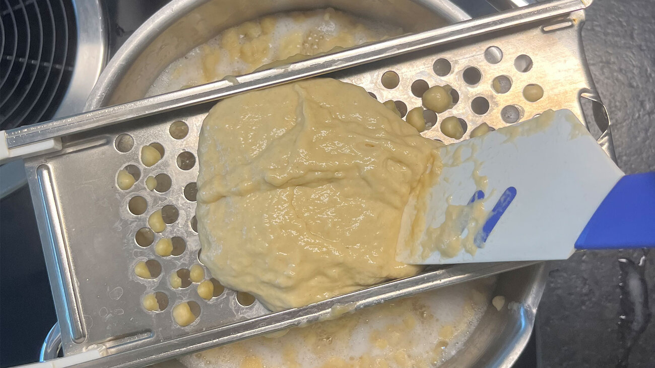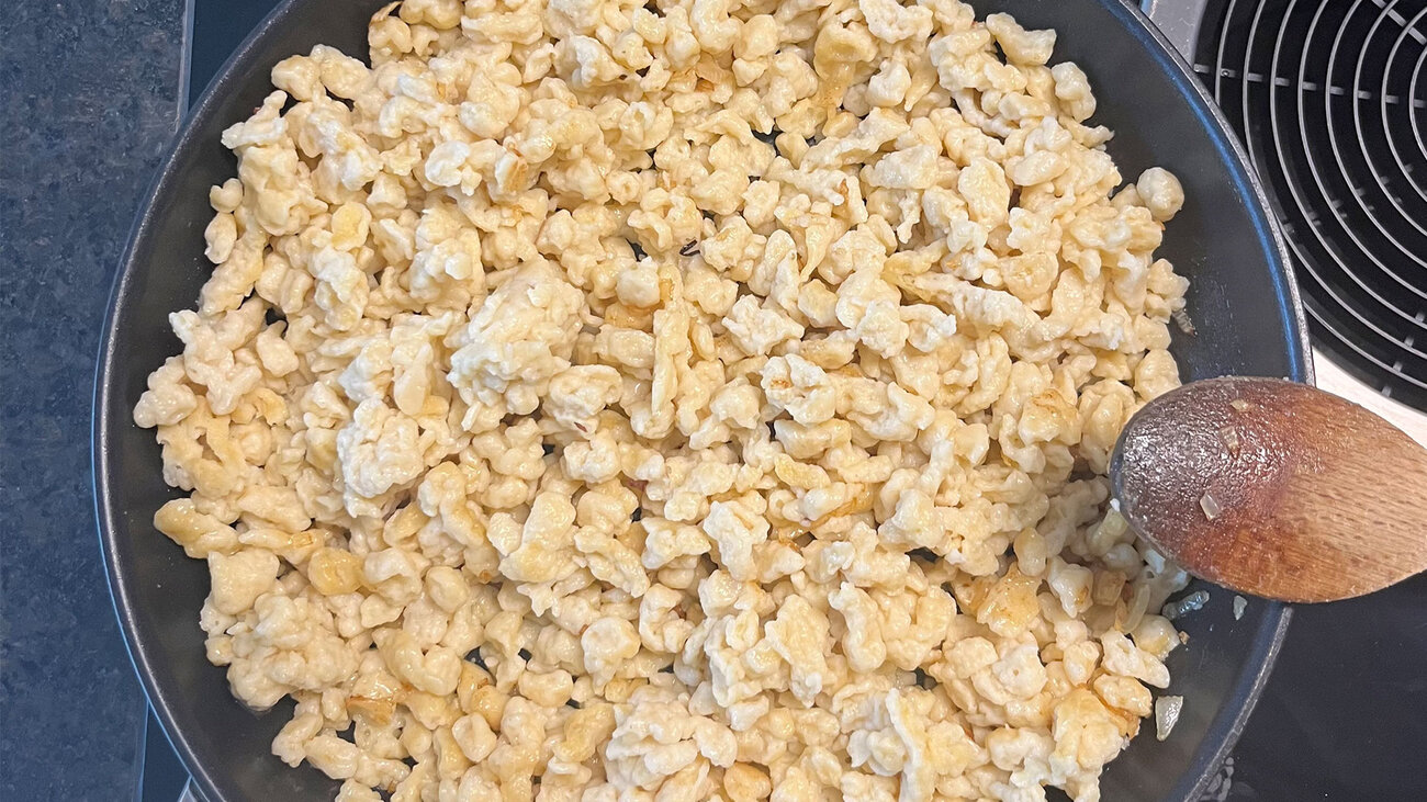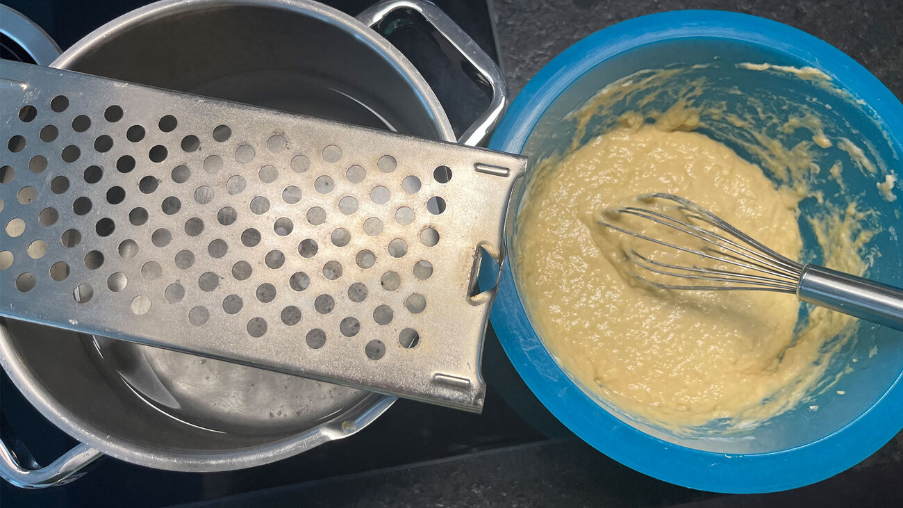 Den Teig mit einem Spätzlehobel in das kochende Salzwasser drücken und einige Minuten köcheln lassen. Wenn die Spatzla an der Oberfläche schwimmen, abseihen und mit kaltem Wasser abschrecken.