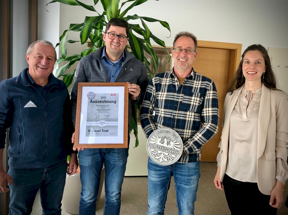 Ja, das stimmt. Die Agrarmarketing Tirol hat vor einigen Jahren das Projekt BEWUSST TIROL ins Leben gerufen. Wir sind einer der ersten Seilbahn-Gastrobetriebe, die 2021 dieses GÜTESIEGEL erhalten haben. In einer eigenen Ecke bieten wir ausschließlich Gerichte an, die zu 100% TIROLER LEBENSMITTEL enthalten: Kaspressknödel, Tiroler Gröstl, Käsespätzle, Rindsgulasch und viele weitere. Das heißt, die Lebensmittel sind in Tirol produziert (geboren, aufgewachsen, gemolken, geerntet, gelegt) und verarbeitet worden. Unser Ziel ist es, die Zusammenarbeit zwischen Tourismus und LANDWIRTSCHAFT zu stärken. Abgesehen von dieser Prämierung versuchen wir tagtäglich möglichst viele Produkte aus Tirol bzw. Österreich zu beziehen. Unser Bergkäse stammt etwa zu 100% von der Komperdellalpe.