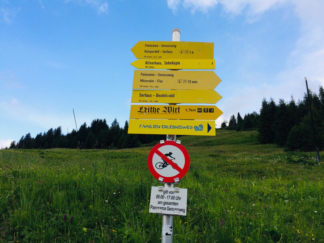 Mich hat die Waldbahn in Fiss zum Einstieg gebeten und hinauf zur Bergstation gegondelt. Anschließend leitete mich der ca. 1,5 km lange Königsleitheweg zum Bergsrestaurant in Serfaus. Nach 30 Minuten erreicht man zu Fuß den Leithe Wirt. Zu Beginn startet man auf dem Familien-Erlebnisweg. Die Bergstationen des Sunliners und der Waldbahn gesellen sich auf 1.800 m nebeneinander. Von Serfaus aus kann man auch den Sunliner zur Bergstation nehmen und dann ebenfalls über den Königsleitheweg gemütlich zum Leithe Wirt spazieren.