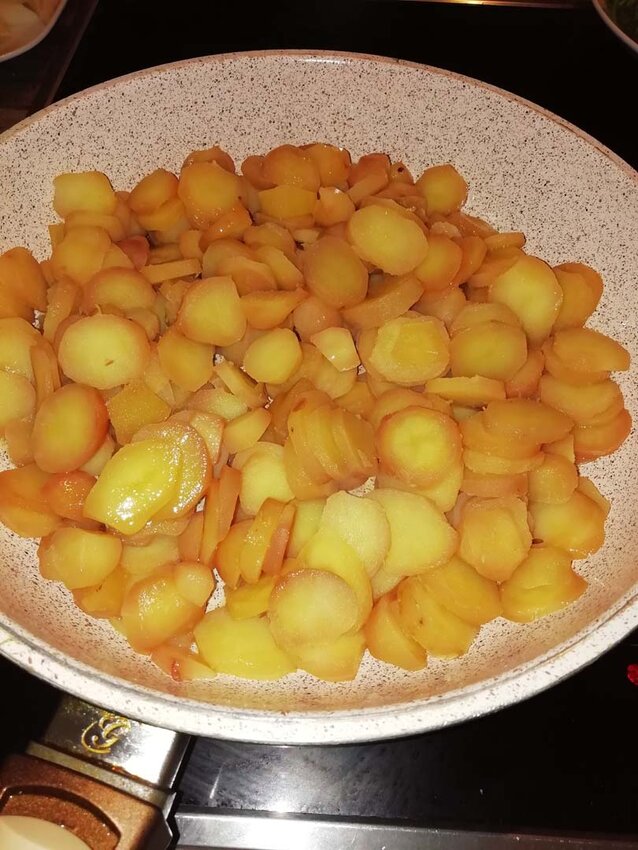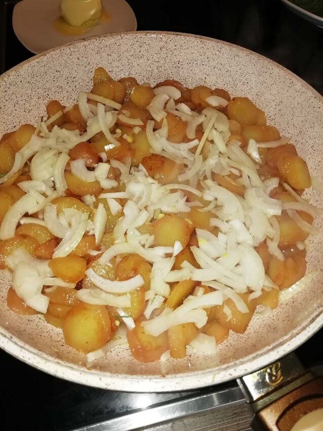 Nun im gleichen Öl die Kartoffeln hellbraun rösten (*mit der Limonisauce starten). Generell gilt: Öl eignet sich besser zum Anrösten von Kartoffeln als Butter. Butter beginnt nämlich schneller, also bei niedrigeren Temperaturen, zu „rauchen“. Butterschmalz hat da schon einen höheren „Rauchpunkt“. Das könnte man hier auch verwenden. Zudem verleiht es dem Gericht einen wunderbaren Geschmack. Anschließend die Zwiebelstreifen dazugeben und weiter rösten. Jetzt schon mal etwas Salz ran.
