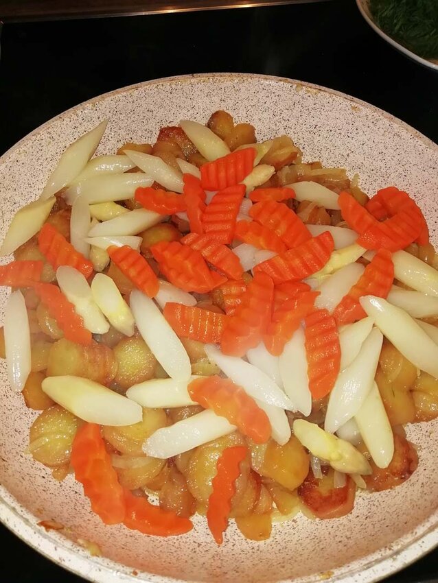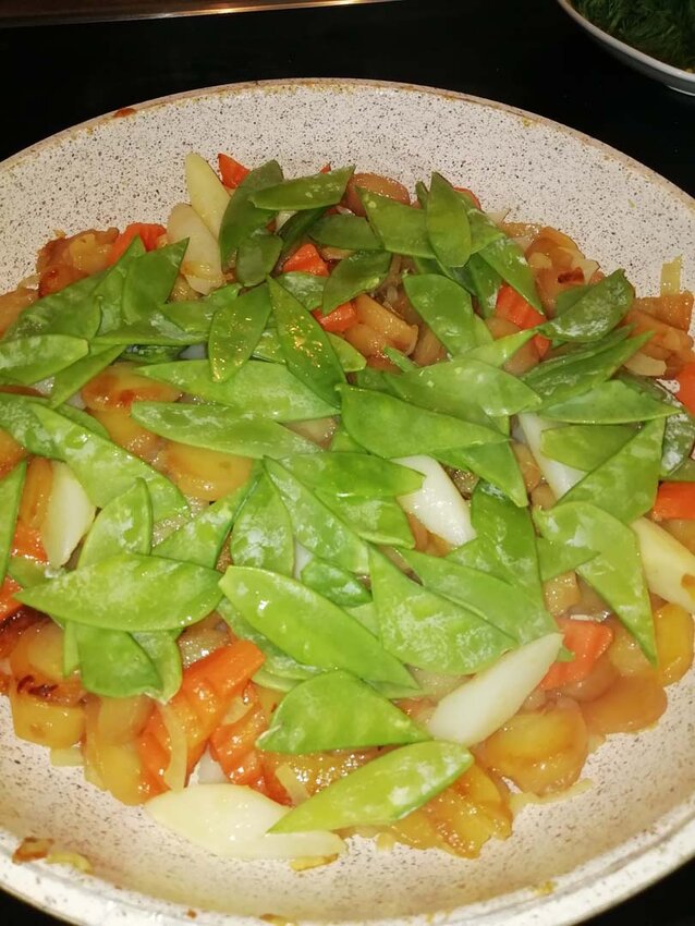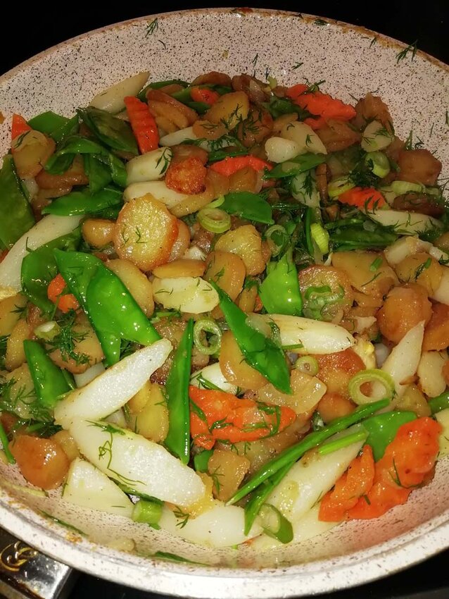 Hat man die gewünschte Bräune erreicht, Spargel und Karotten hinzuschwenken bis diese warm bzw. heiß genug sind. Jetzt noch die Erbsenschoten und Dill dazugeben und schnell unterheben. Nochmals mit Salz und Pfeffer abschmecken und 1 EL Butter dazugeben. Den krossen Knoblauch untermengen. Fertig!