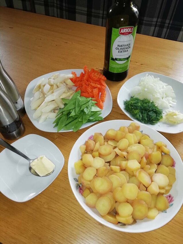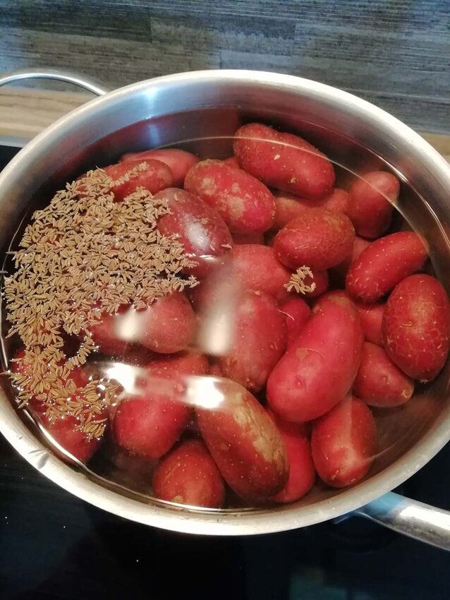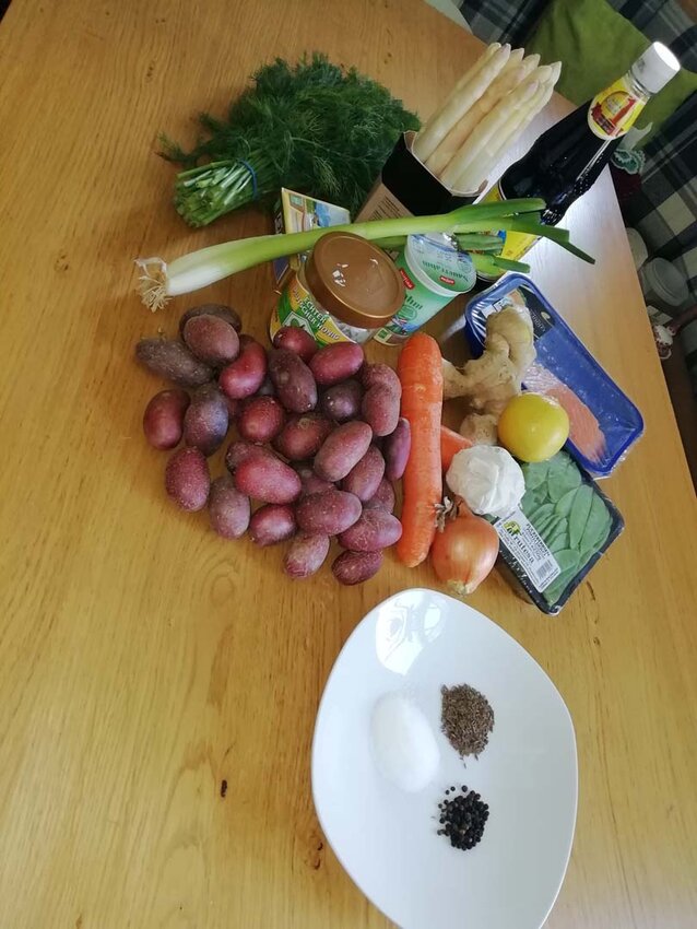 Kartoffeln mit Salz und Kümmel nicht zu weichkochen. Auskühlen lassen, anschließend schälen und in Scheiben schneiden. Kartoffeln beiseitestellen. Alle weiteren Zutaten auch in ihre Form bringen. Tipp fürs Spargelschälen: Nimm einen umgedrehten Topf, lege ein Geschirrtuch drauf und beginn mit einem Spargelschäler mit dem Schälen. Spargel bricht sehr schnell, auf dem Topf liegt er ruhiger und man schont zugleich seinen Rücken.