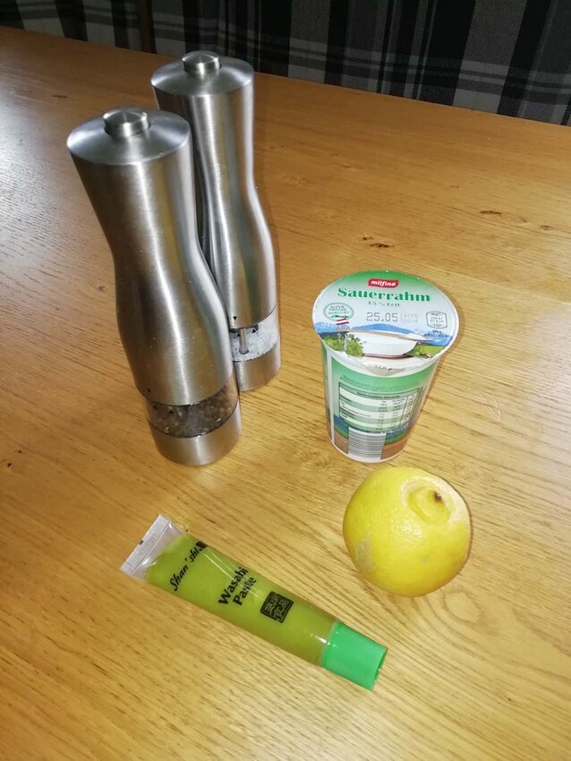Alle Komponenten in einem geeigneten Gefäß mit dem Stabmixer kräftig aufmixen. Sollte man machen, wenn man mit dem Anrösten der Kartoffeln beginnt. Anschließend bis zum Anrichten beiseitestellen. Jetzt hat die Sauce Zeit, dass sich der Geschmack entfalten kann und auch noch mal bisschen anzieht (direkt nach dem Mixen ist sie etwas dünn).