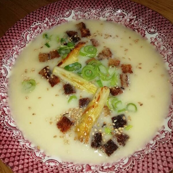 Suppe mit Brotcroutons, gebratenen Spargelspitzen, in feine Ringe geschnittenem Junglauch und gerösteten Sesamsamen servieren. Mahlzeit!