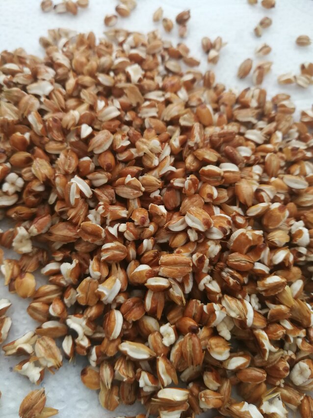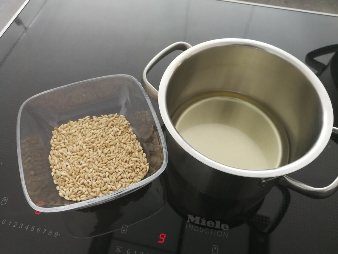 - Vorsicht, da das Fett extrem heiß ist. Gut aufpassen, besonders wenn kleine Köche dabei sind. Achtung: Die Gerste darf nicht zu lange im Fett gebraten werden, da sie sonst bitter wird. Das Verpuffen der Gerste ergibt einen angenehm nussigen Geschmack.