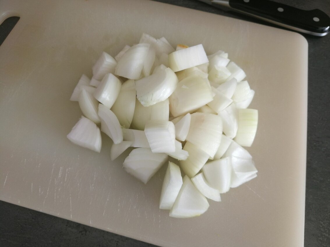 - Zwiebel schälen und grob schneiden, den Kürbis waschen, mit einem Löffel das Kerngehäuse auskratzen, danach in 1,5 cm große Würfel schneiden.