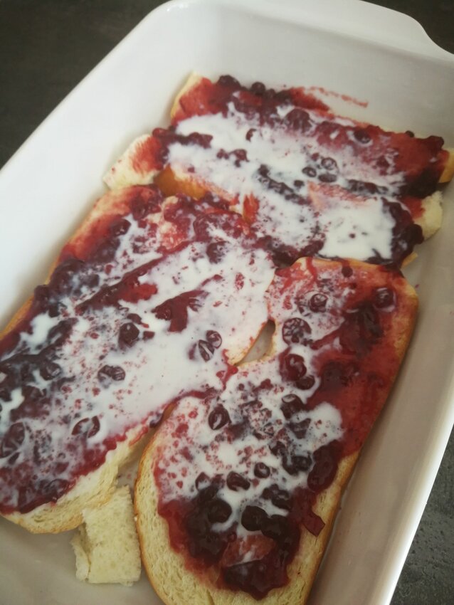 - Das Brot in eine Auflaufform legen und mit Marmelade bestreichen. Mit Milch das Brot ein wenig tränken.