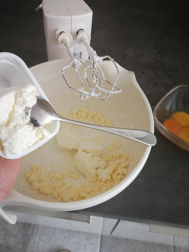- Aus Butter, Staubzucker und Zitronensaft einen Abtrieb herstellen und den Topfen kräftig einrühren.