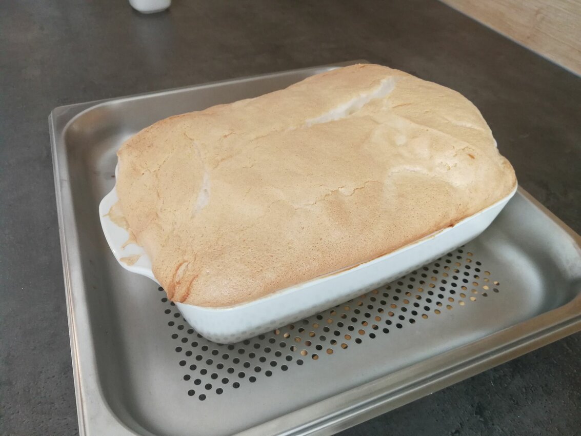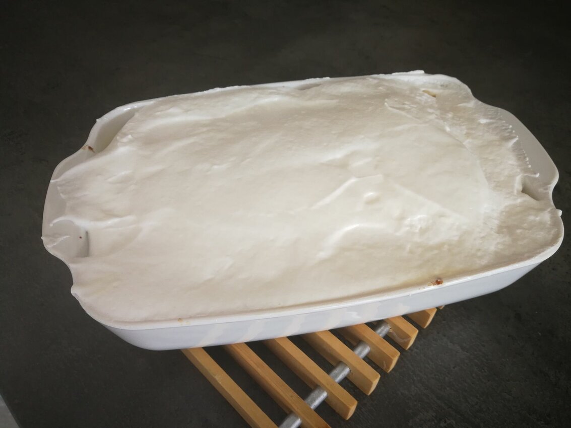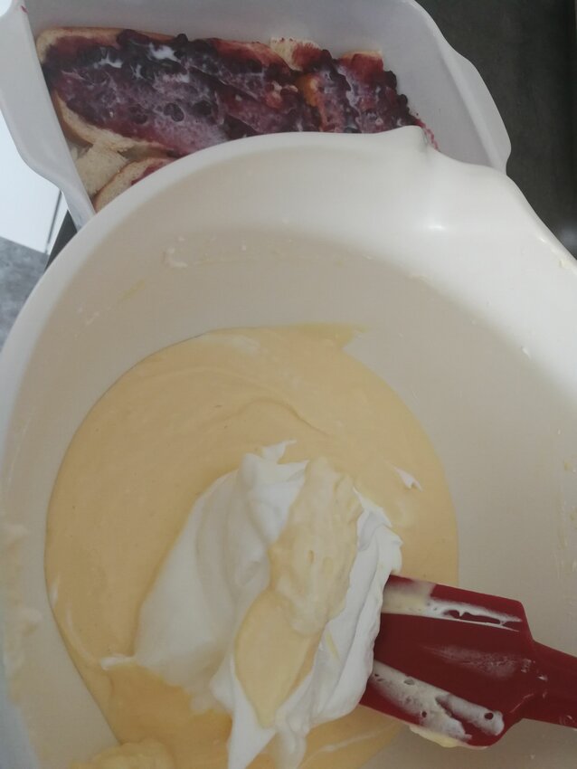 - 4 Eiweiße mit dem Kristallzucker steif schlagen. 1/3 der Eiweißmasse gleich in die Topfenmasse rühren, auf dem Brot in der Auflaufform verstreichen und bei 175° C ca. 20 min vorbacken.