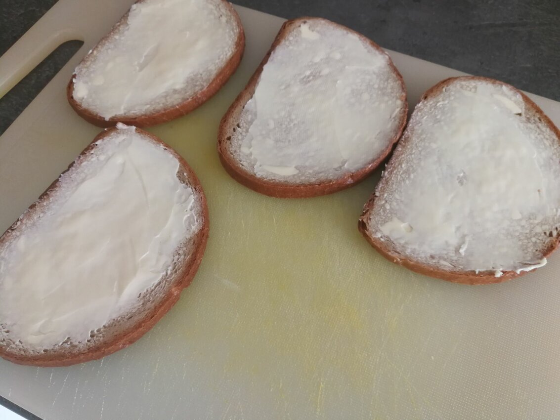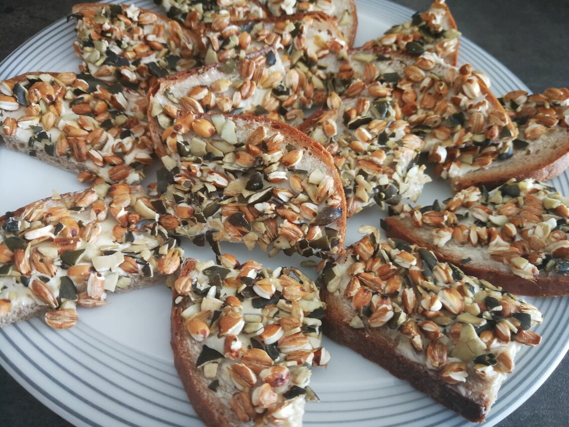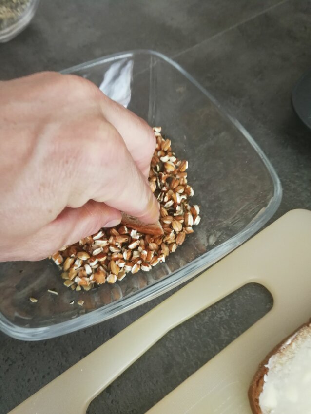 - Das Schwarzbrot mit reichlich Butter bestreichen und in die Kerne drücken.