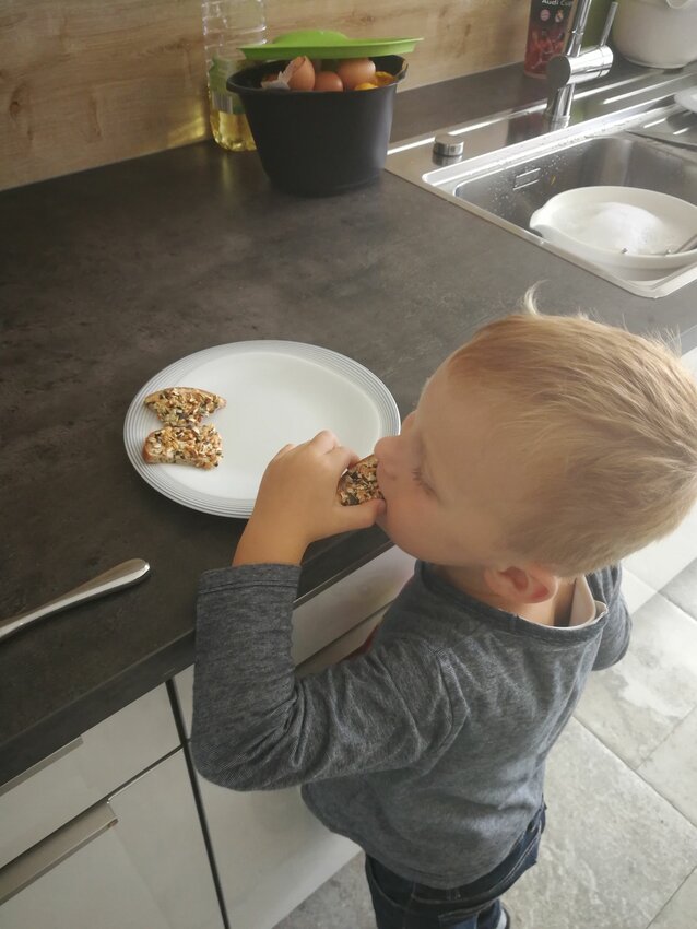 Anschließend die Kürbissuppe mit Kürbiskernöl und den Gerstenkrusteln anrichten und Löffel für Löffel genießen. Meinem Sohn Paul schmeckt die Suppeneinlage auch sehr gut und er hat gleich das eine oder andere vom Teller stibitzt.