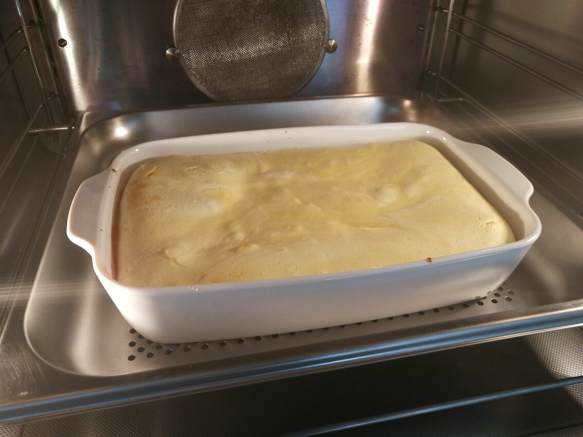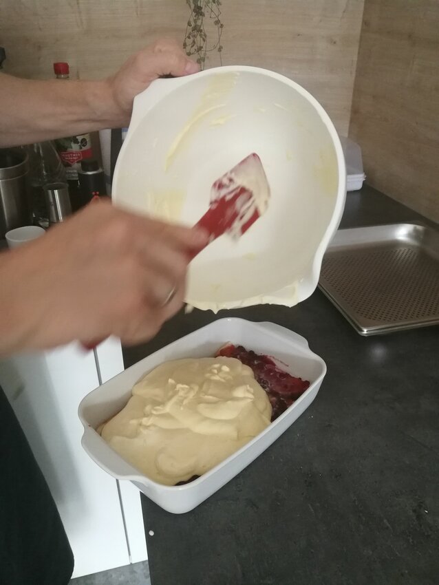 - Danach die restliche Eiweißmasse darauf geben und bei 190° C 12 min anbacken und bei 150° C 15 min fertig ausbacken.