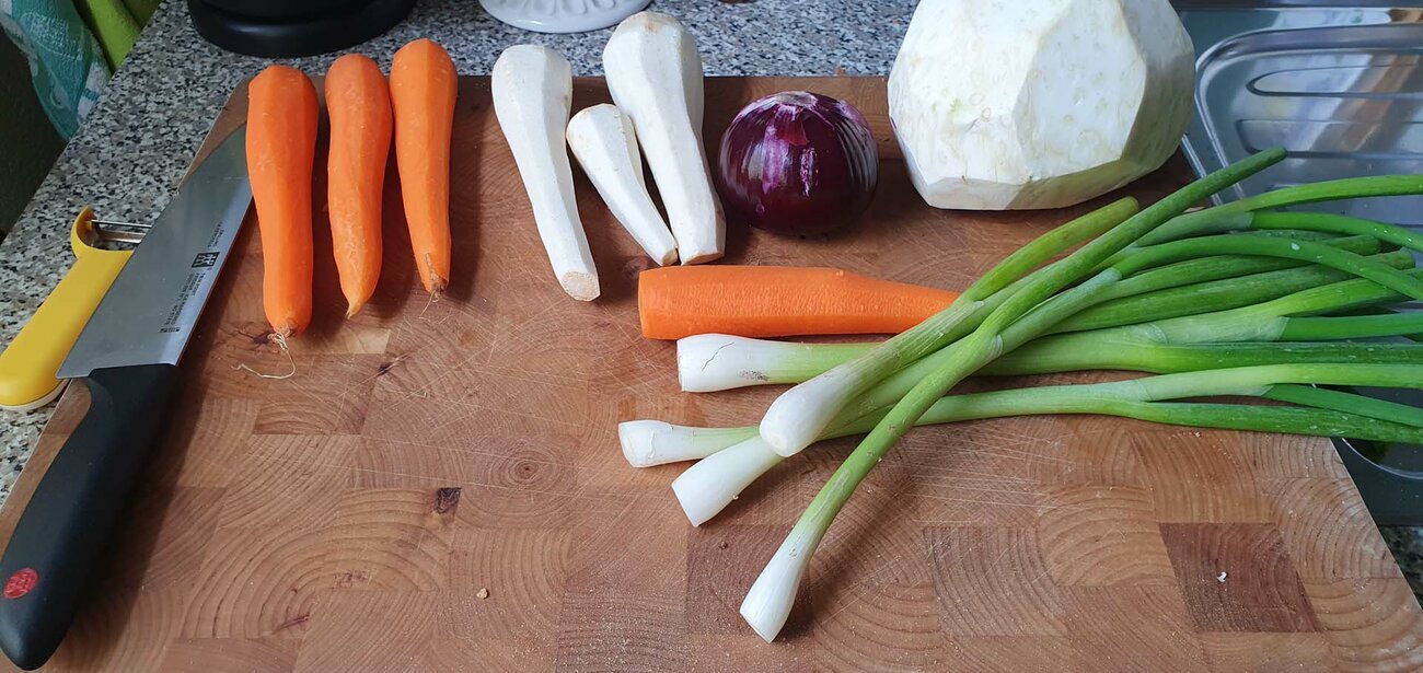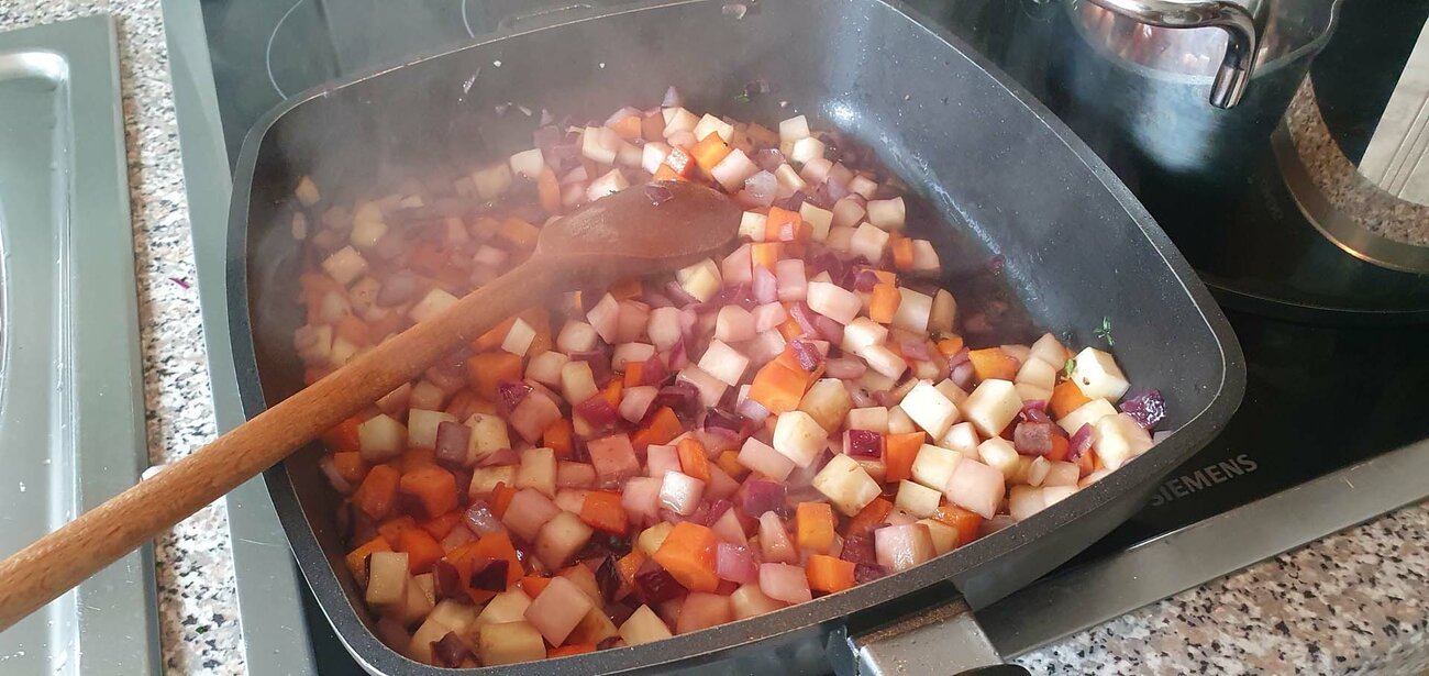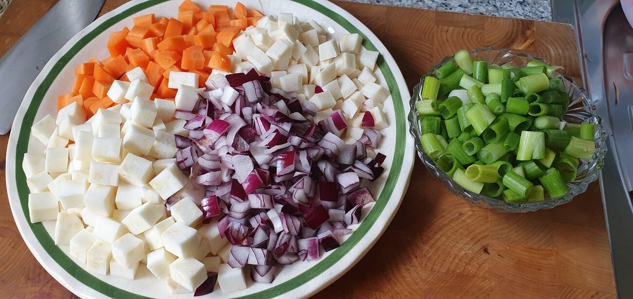Das Gemüse schälen und in Würfel schneiden (1x1 cm).